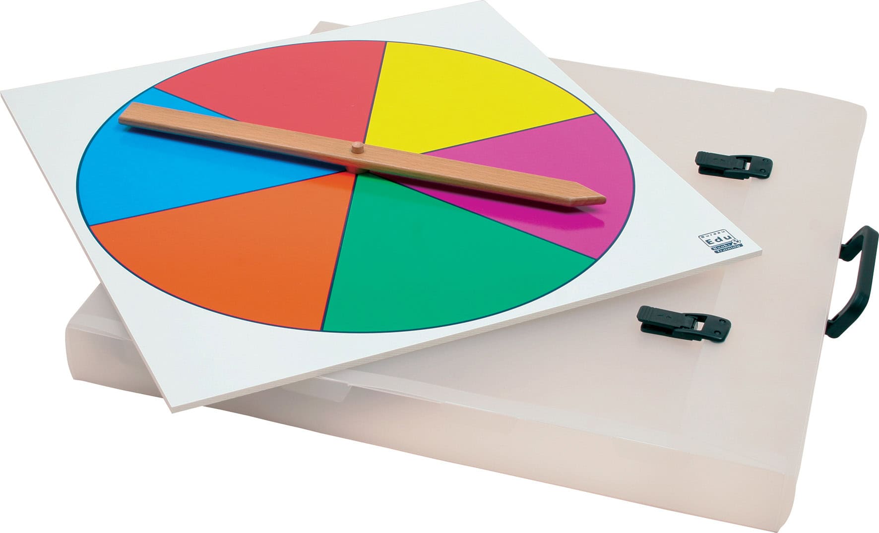 Turning the large wooden pointer on the dial with 6 category colors determines from which pile of cards a question is taken. The colorful 50 x 50 cm dial has a hefty pointer that turns easily. It is an activating game attribute that can be used instead of the supplied color die in many games (in games that contain game cards with 5 or 6 themes, each with its own color), for example in Vragenderwijs and the Levensloopspel. The dial can be supplemented with various overlays.