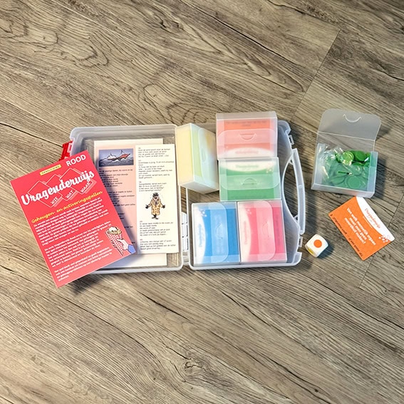 This game is completely renewed and now looks even more beautiful! The series of cases ‘Vragenderwijs’ is well known in the Netherlands! The cases contain sets of cards with questions that stimulate memory. Questioning Red Volume 1A is a memory game with 300 questions on Proverbs, Songs, Language, Nature, and Miscellaneous. The questions are suitable for reasonably vital elderly people and stimulate memory in an enjoyable way. The questions are in large print on the sturdy, professionally laminated cards. Below each question is a tip for finding the answer. On the back is the answer to the question. In the clear manual you will find game forms and information about memory. Chips are used to control the scoring. There is also a song manual with first 4 to 6 lines of each song.