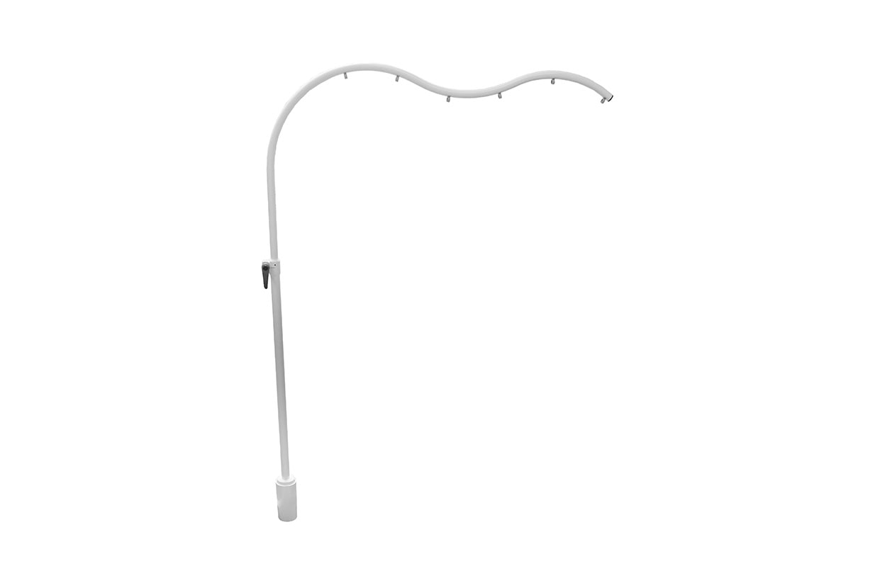 This extra-large wavy play arch with five metal attachment eyelets can be used on the white mobile undercarriage of an activity table and, in combination with it, is adjustable in height from 110 to 170 cm. The large play arch is used with a special coupling piece between the play arch and the wheeled undercarriage. An ideal tool to offer hanging toys for practically anyone who is in a wheelchair or on a stage, in a bed or bed box.