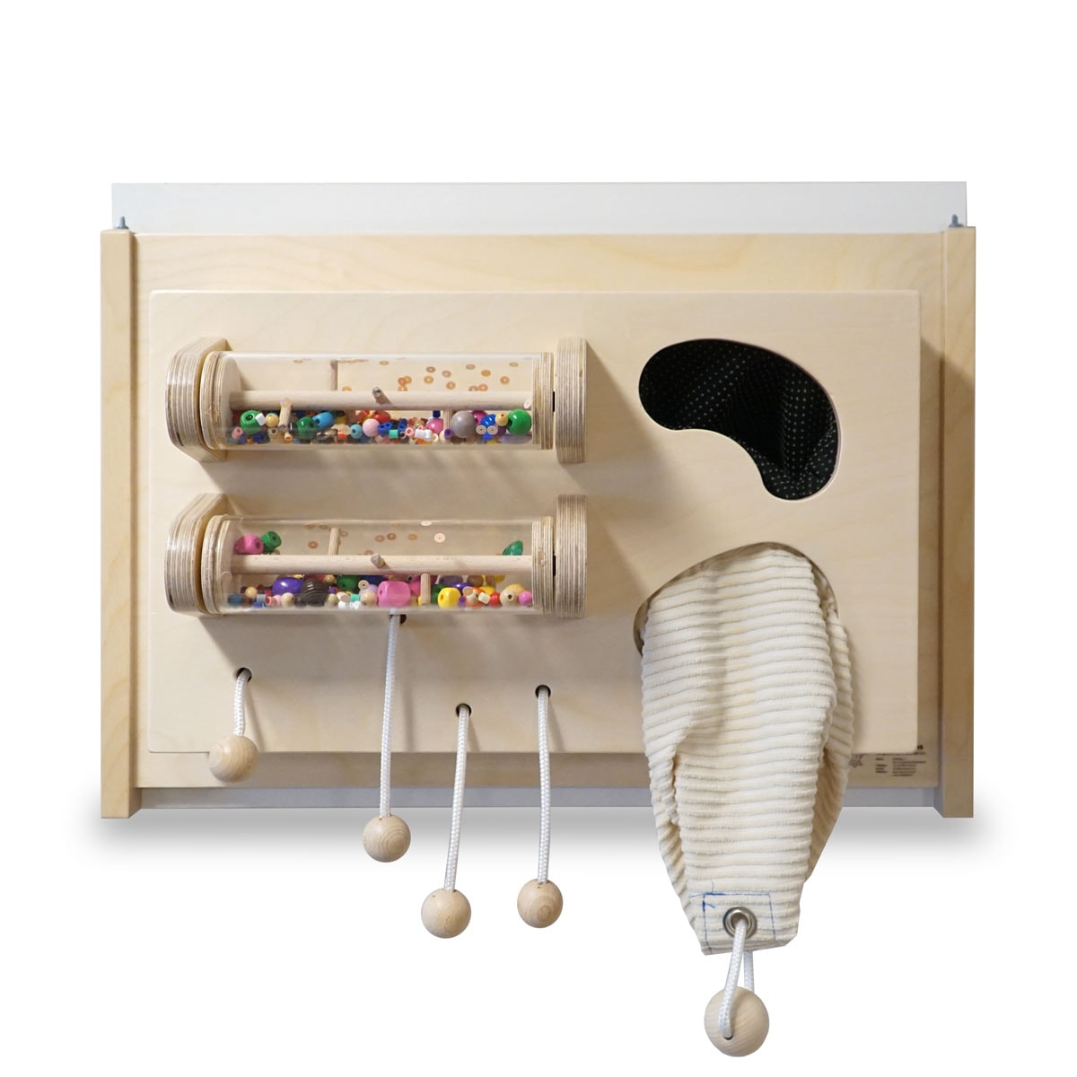 This plate gives an action-reaction effect. By pulling, twisting or feeling parts, you automatically find a reward. In addition to the sense of touch, the visual aspect is also stimulated. Touch, color, sound and movement are central. The game boards can be slid into the wall slide frame (ordered separately) and are therefore easily interchangeable. The frames can be placed on a wall, but also on a mobile activity table, so that the game boards can be used almost anywhere.