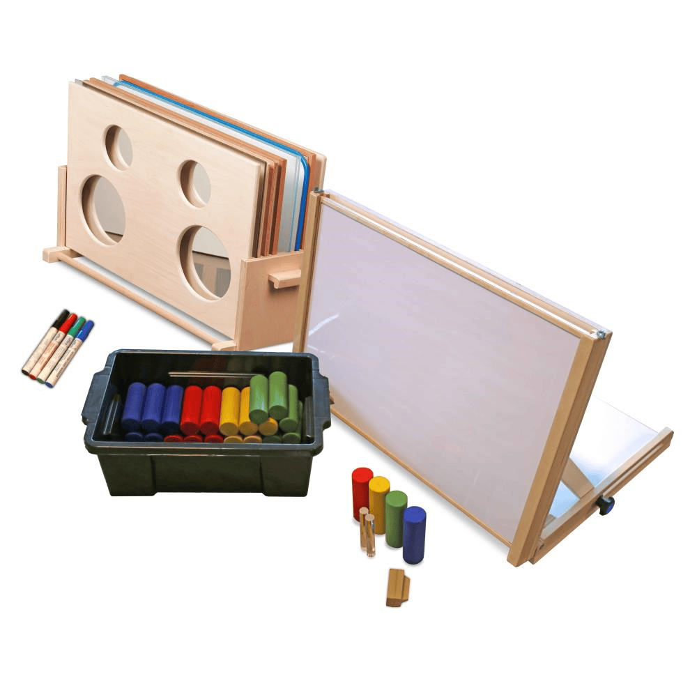 The complete play-learning system includes: - a sturdy frame made of beech wood, easily adjustable from horizontal to vertical position - a set of nine play-learning plates sliding into the frame - a storage stand for the play-learning plates - a…
