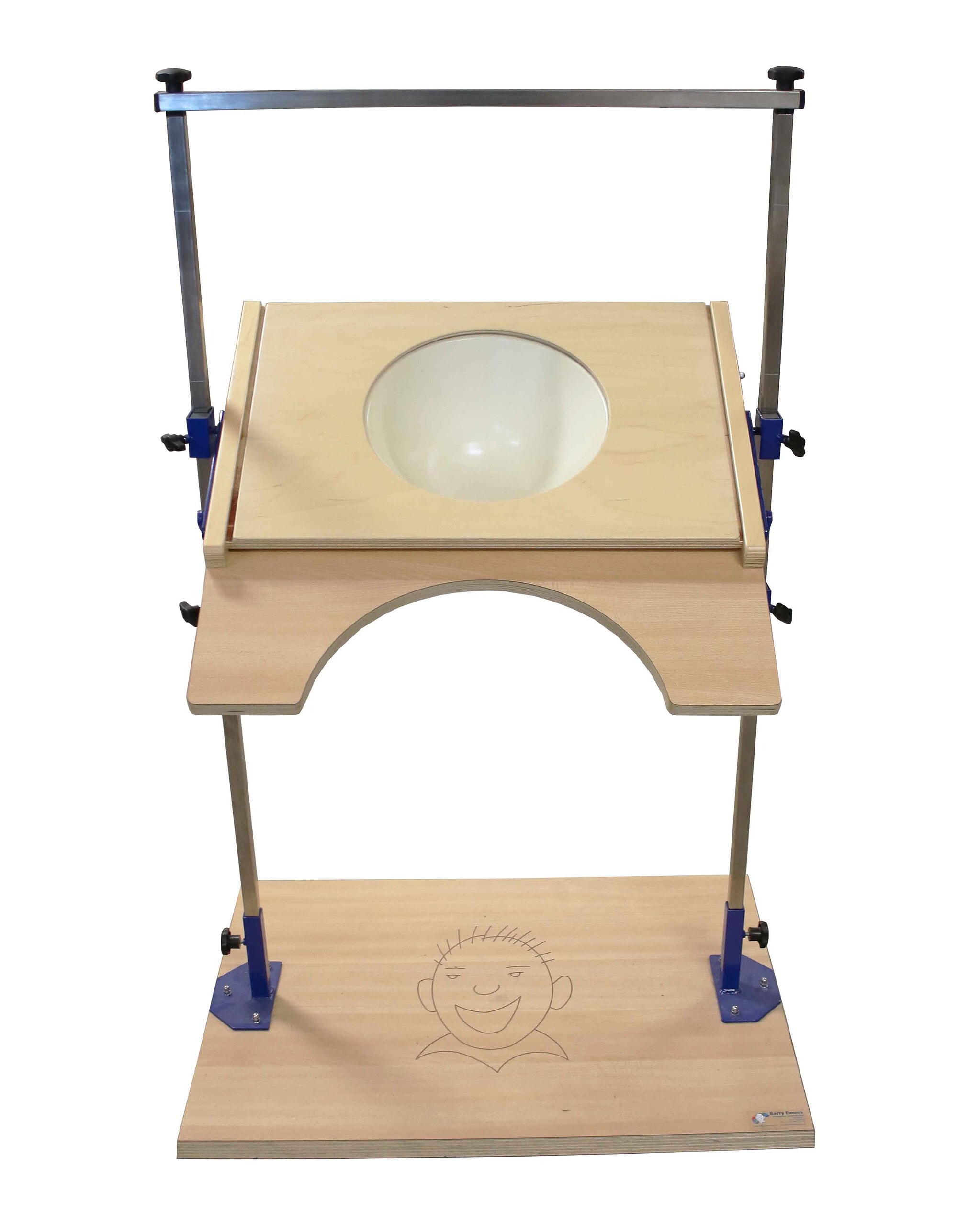 Extra wide version of our standard Play Table (BE01352)! The play table is an ideal tool for the disabled, both children and adults. From the wheelchair or standing board, sitting on the floor, or from a prone or supine position, an optimal play-work surface can be provided even for multiple disabled persons. The play table is suitable for use by one person, or by two people facing each other, for use in different rooms, easy to disassemble and transport, in order to be able to offer everyone and in any position an optimal play-work surface in the best possible position, and to apply approx. 40 different, interchangeable play-work surfaces which make many activities possible. By an easy to operate adjustment mechanism, any height (from approx. 20 to 115 cm) and any desired position between horizontal, vertical and beyond vertical can be set. The play table includes the following standard parts: wooden board with round cutout, plastic bowl, metal arch, two protective knobs. Width (between uprights) 82 cm, height 126 cm.