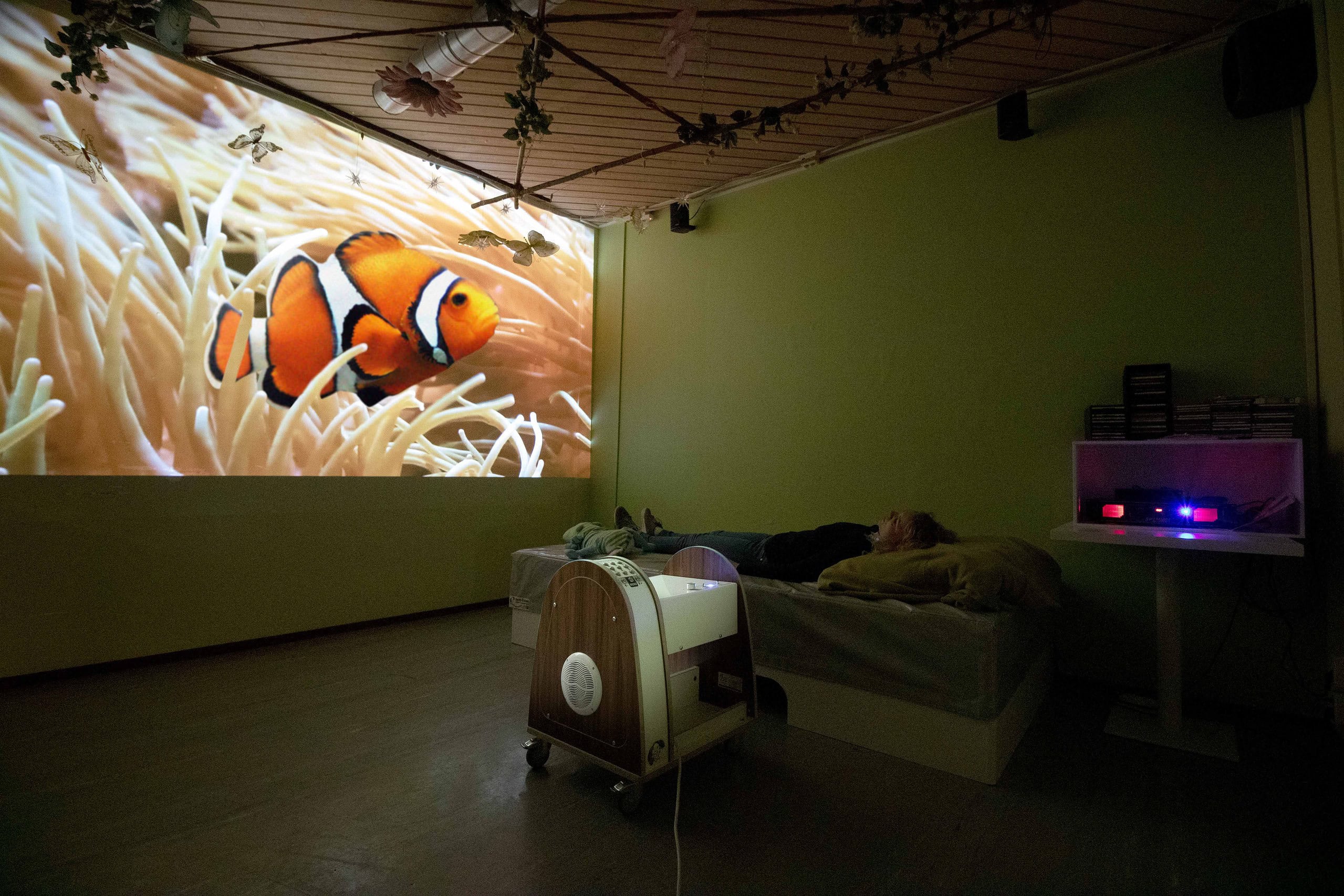 The SensiView has a user-friendly control system with simple buttons and comes standard with 9 different, soothing themes. At the touch of a button, you select the desired theme. It is also possible to play personal photos, videos and/or music via a USB stick. The image is projected onto the wall. The 9 standard themes are: forest walk, underwater world, cloudscapes, starry sky, train trip, butterfly garden, beach walk, mandalas and winter walk.