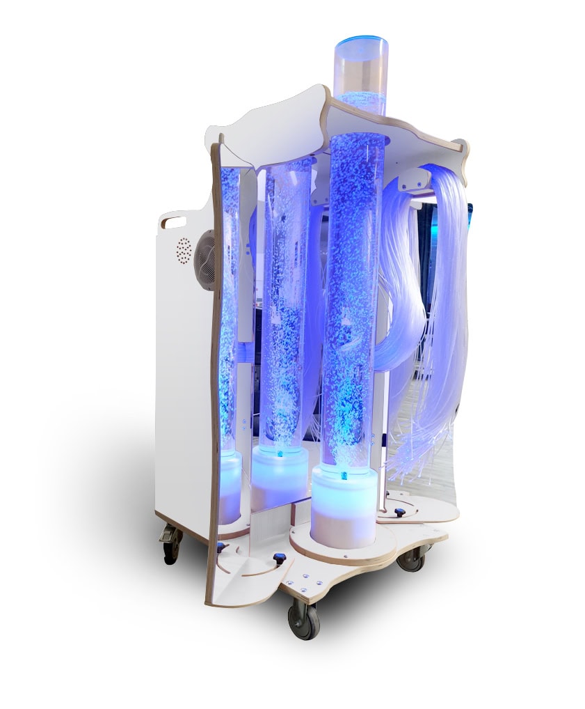Our slimmest model, Snoezelkar Eric Deluxe is therefore very handy in smaller spaces. The built-in bubble unit comes into its own even better because of the fold-out sides with impact-resistant mirrors.