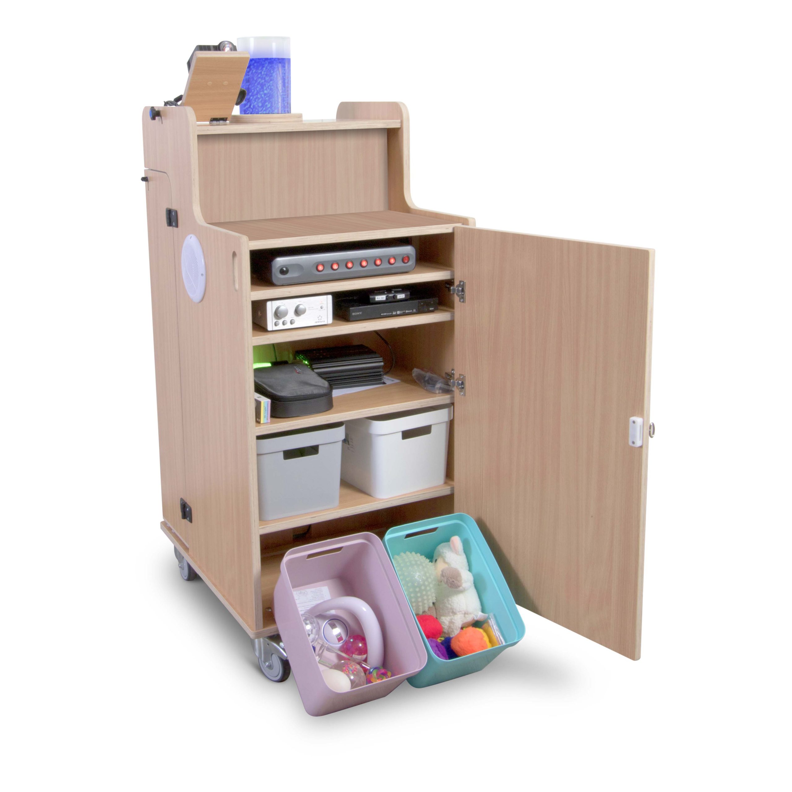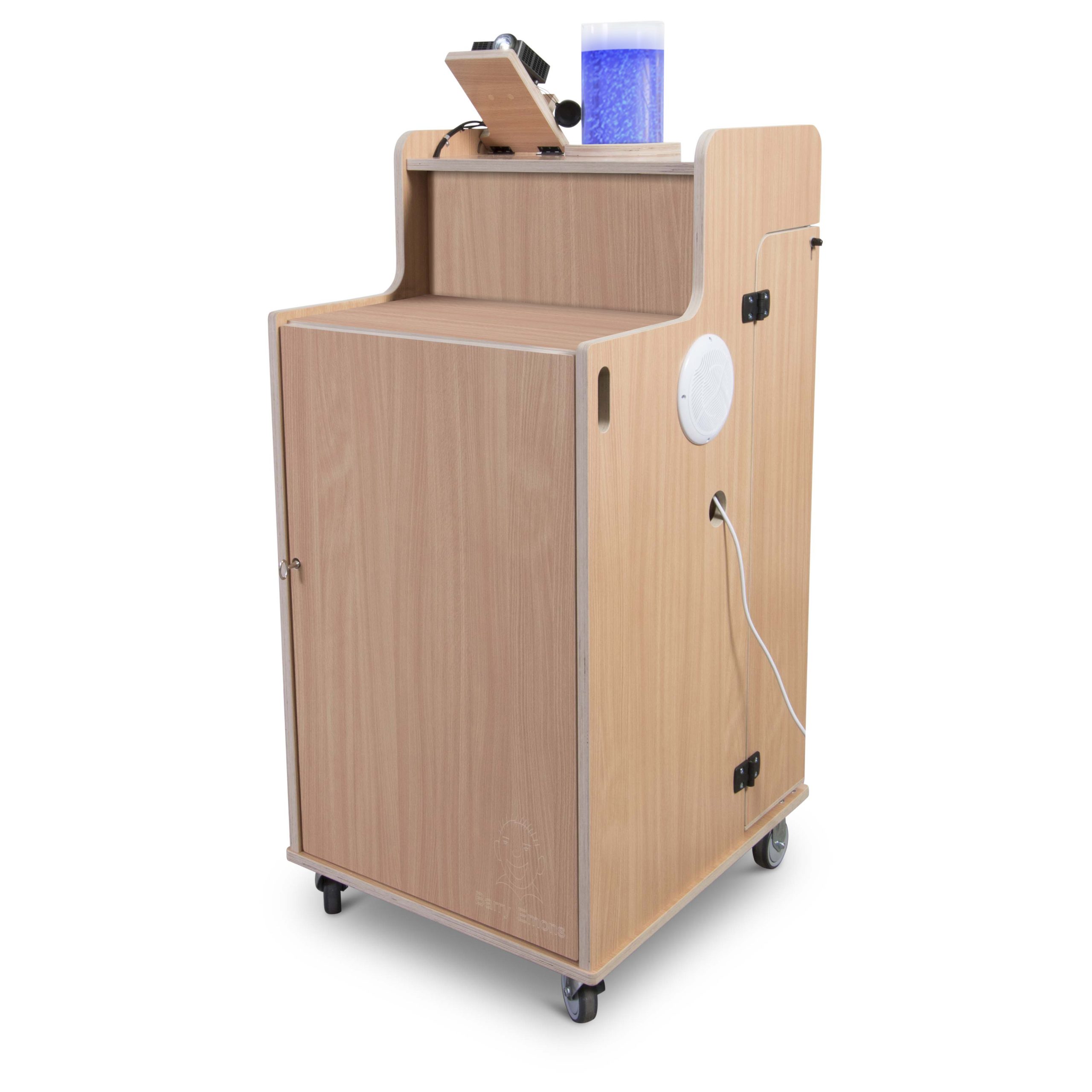 Bubbles, projection: all functionality is integrated in the Sophie snoezelen/sensory cart. The ergonomic cart stands on sturdy wheels (3 casters and 1 fixed wheel) and can be used anywhere. It is equipped with various elements that can stimulate your senses: music, images and the bubble unit.