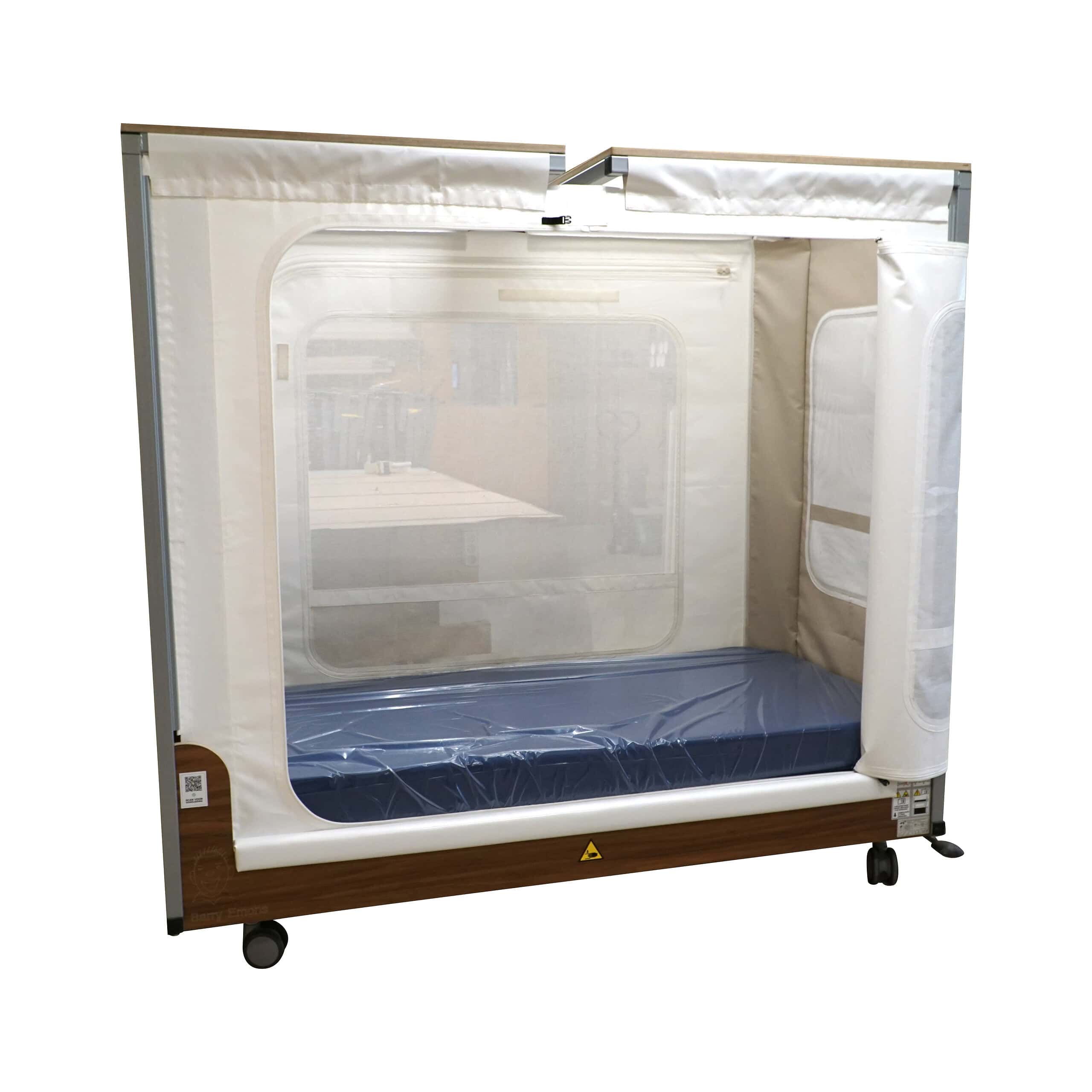 The bed comes standard with a zipper opening on one long side. The front and sides have netting for ventilation. A high-low system with a three-part adjustable base is standard, as well as the opening in the top rail for a ceiling elevator. The bed is centrally braked on 4 casters.