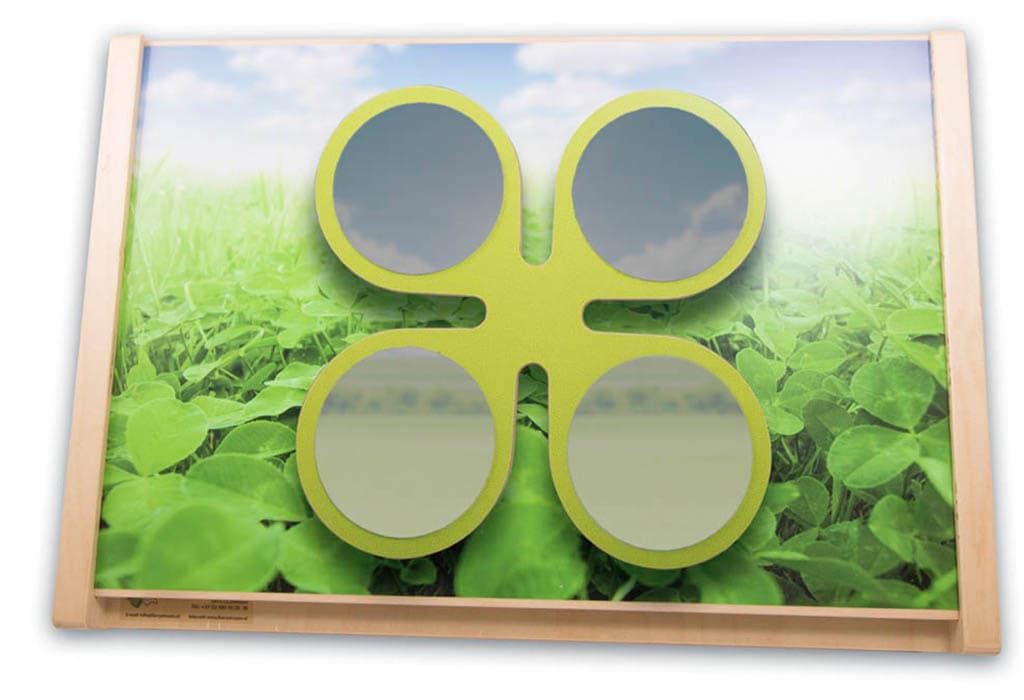 A four-leaf clover in a sea of clovers that both rings and mirrors. A rock solid and fun activity plate. Dimension of acitvity plate: 57.5 x 39.5 cm