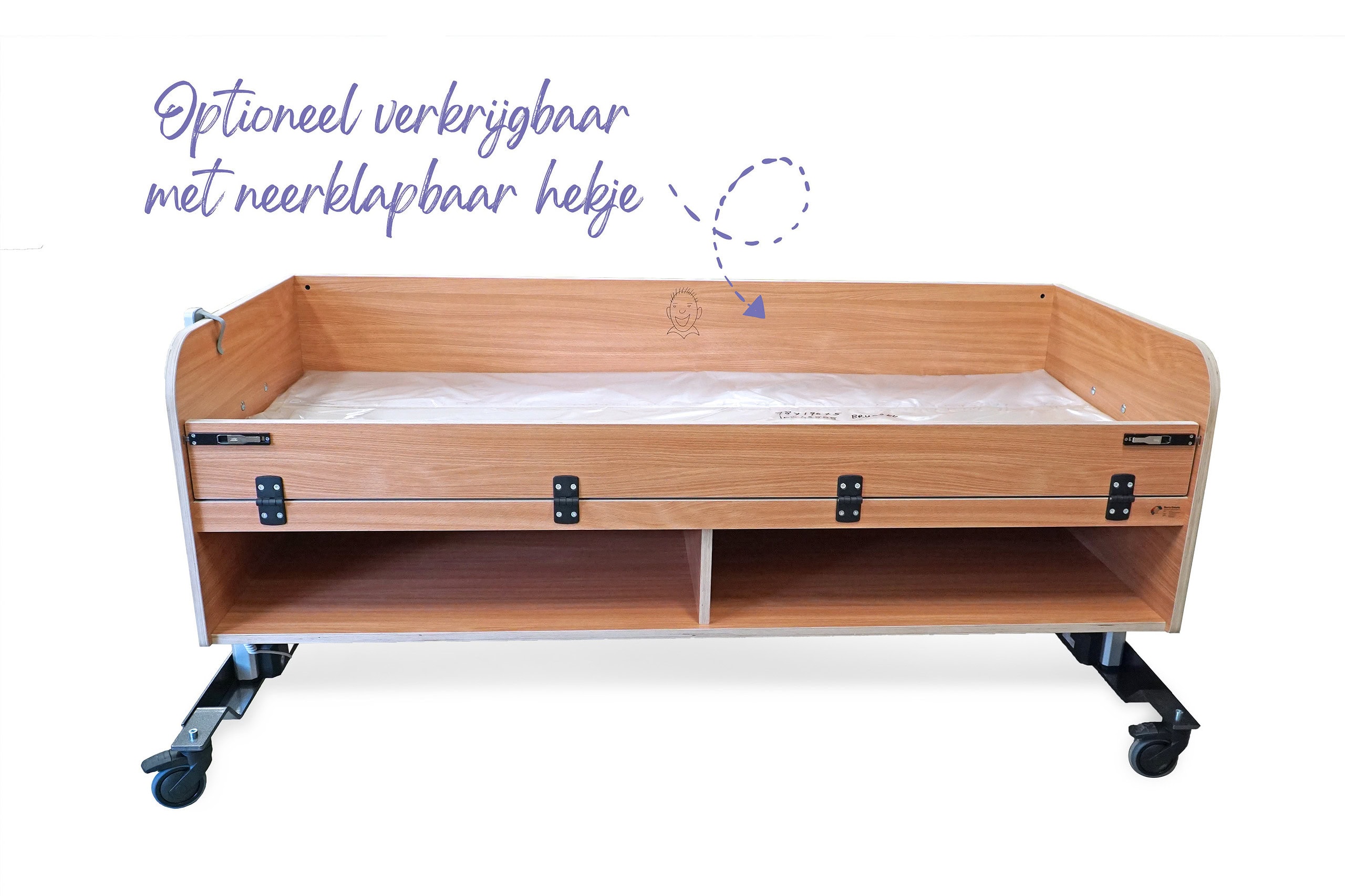 Aankleedtafels zijn volop te krijgen bij veel bedrijven. Het onderscheid in kwaliteit en constructie is dan ook enorm. Onze Jim aankleedtafel is ontwikkeld in de praktijk; daarom is hij mooi, robuust en plezierig voor professional en cliënt. Hij is niet alleen geschikt voor kinderen. De Jim is namelijk te verkrijgen in twee formaten. Het ligvlak van de tafel is 80 x 140 cm of 80 x 190 cm (binnenmaat). Het hefvermogen is maar liefst 300 kg. De werkhoogte kan variëren tussen 67 en 107 cm (incl. het aankleedkussen van 5 cm). Het aankleedkussen is bekleed met Stamskin. De wielen zijn 10 cm hoog. Onder de volledige lengte van tafel is een opbergvlak in twee delen aanwezig, waar u handdoeken, kleding ed. in op kunt bergen. Optioneel is een valbeveiliging verkrijgbaar die als neerklapbaar hekje aan de voorzijde gemonteerd word (art. BE00608)