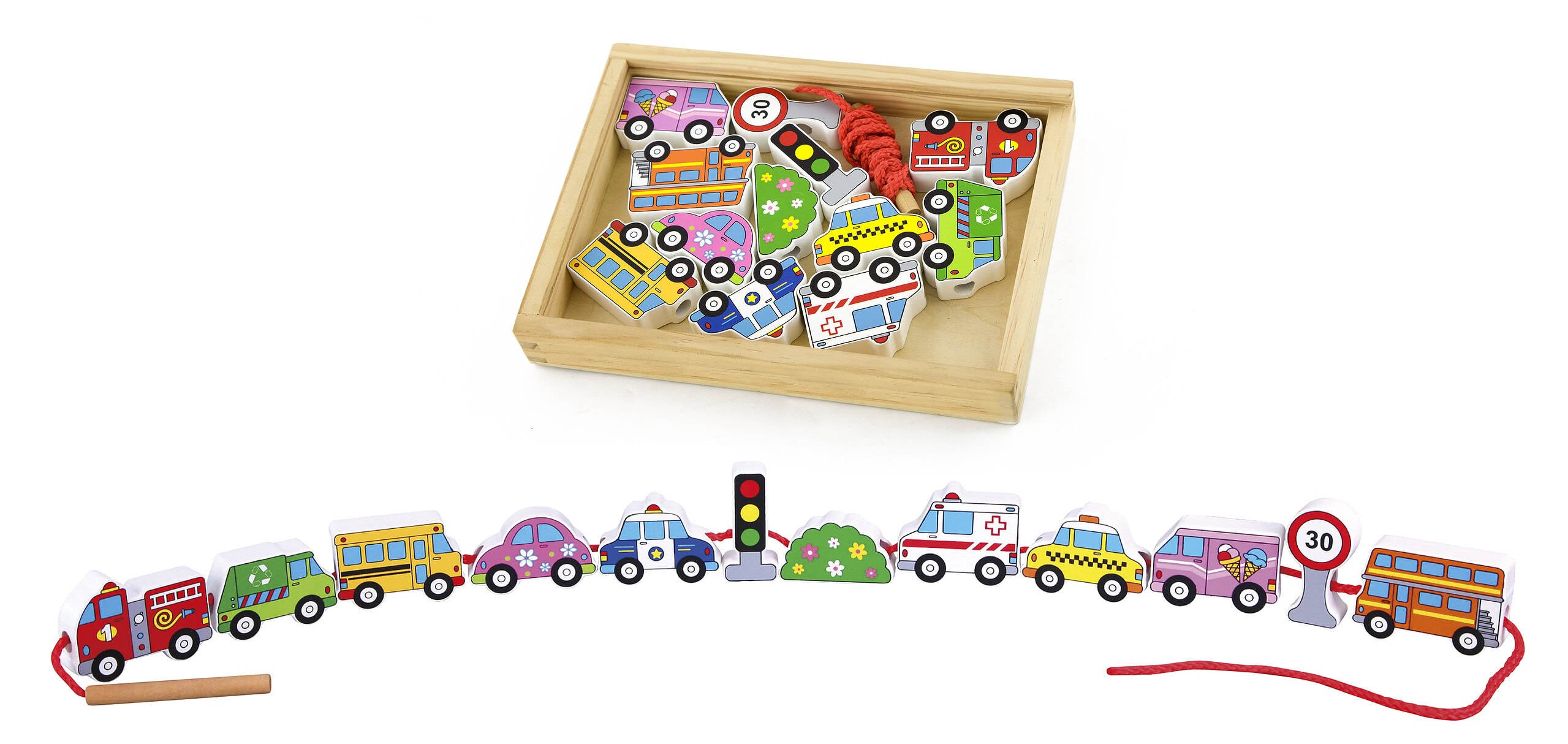 Maak je eigen snelweg met deze blokken die aan elkaar worden geregen met een touw. Hieraan zit een houten "naald" voor makkelijk richten. De blokken zijn 3 cm dik.
