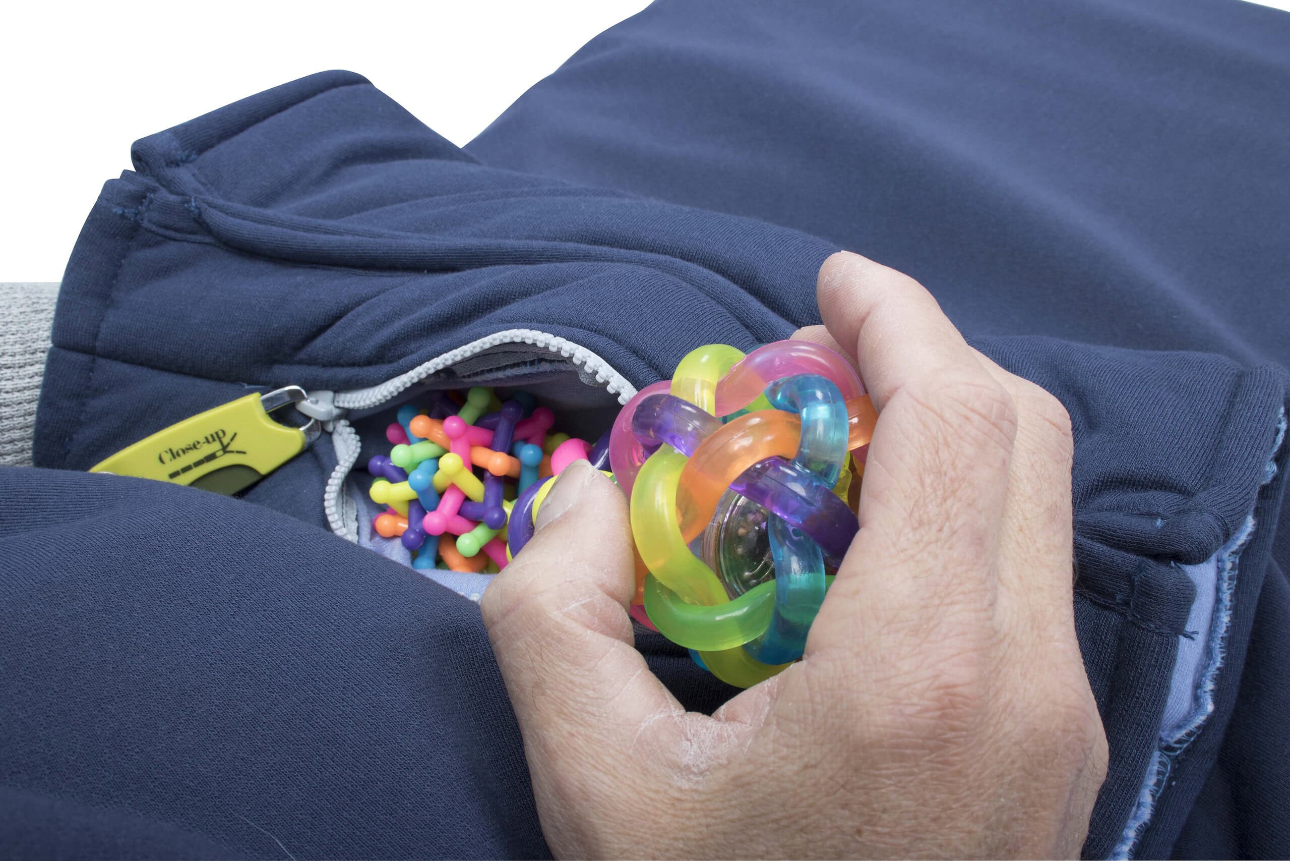 Dit belevingsschootdeken in de kleur blauw is voorzien van een muff, ceintuur en drukknooplint aan de binnenkant. De muff is voorzien van een geïntegreerde tastbuidel, waarin kleine (tast)materialen ‘verstopt’ kunnen worden. Deze tastbuidel is afsluitbaar middels een close-up sluiting. Het schootdeken is eventueel samen met een apart verzwaringsdekentje van 3 kg (art. BE05187) of 5,5 kg (art. BE05188) te gebruiken. Het deken is wasbaar in de wasmachine.