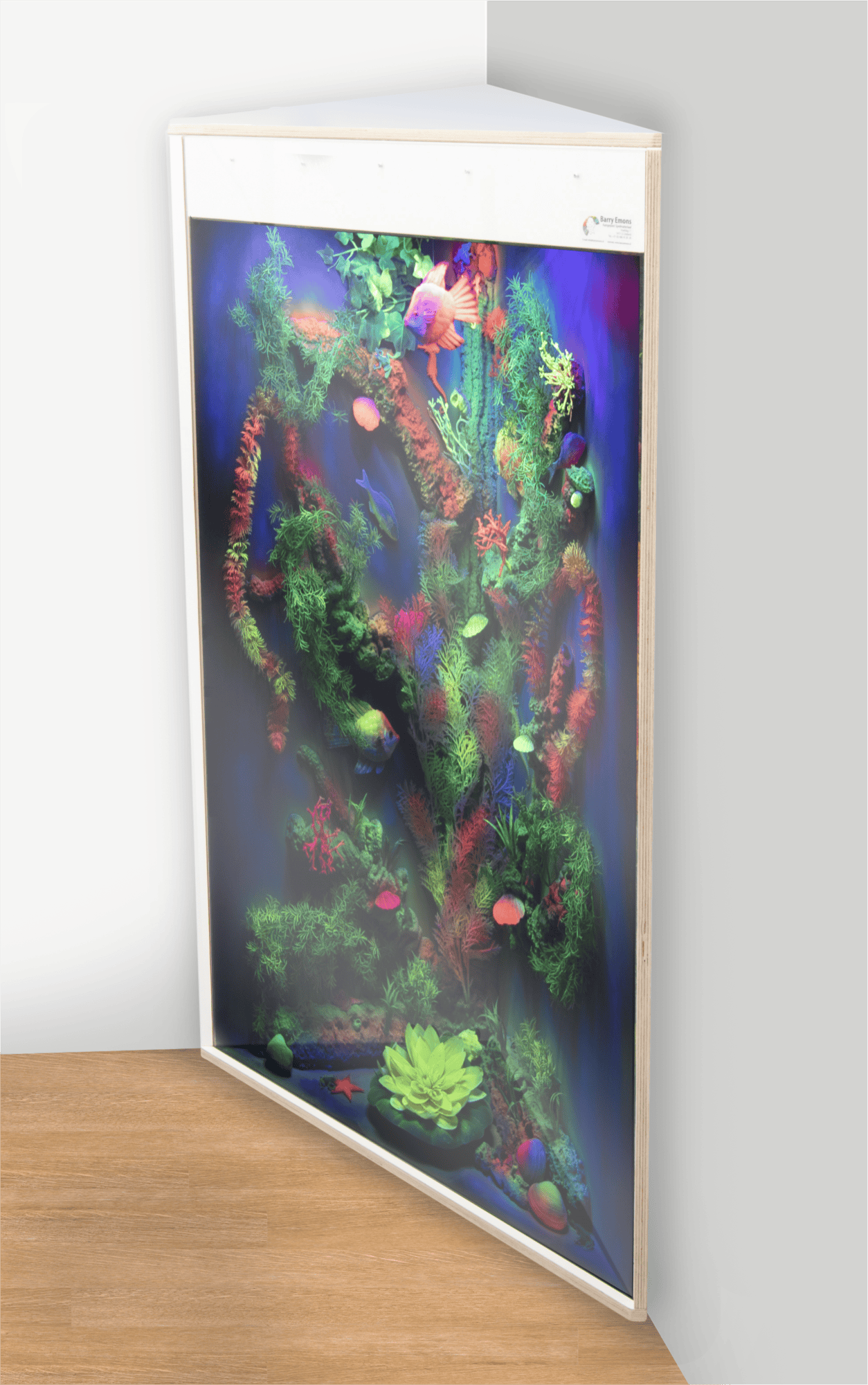 Deze blacklight hoekkast in berken wit is een rustpunt in een snoezel- of groepsruimte. Een boeiende kijkkast die door de schitterende kleuren en het draaiende object blijft fascineren. Op aanvraag is het aquarium ook leverbaar met meerdere draaiende elementen, andere thema’s of in een andere afmeting. Bel of mail ons voor de mogelijkheden! Deze afbeelding dient slechts ter illustratie en kan afwijken van het geleverde product. De afmetingen zijn 85 x 125 cm hoog. De diepte is 42 cm, echter de zijkanten zijn 60 cm lang.