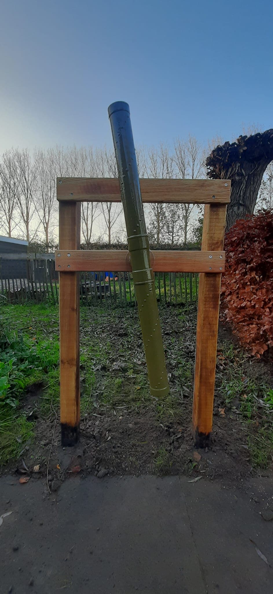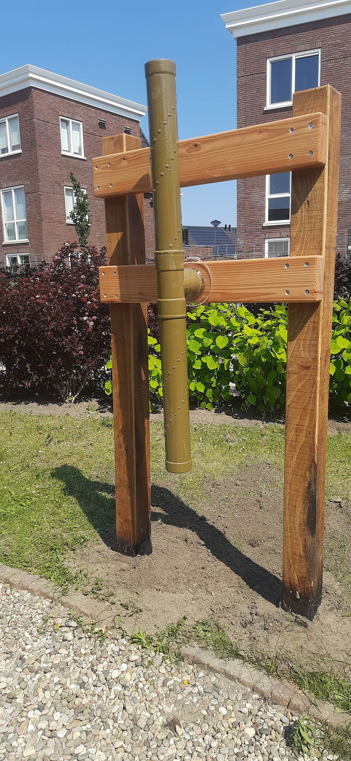 Deze (kunststof) rainmaker op palen is draaibaar en daarmee is het "raineffect" optimaal te beleven.