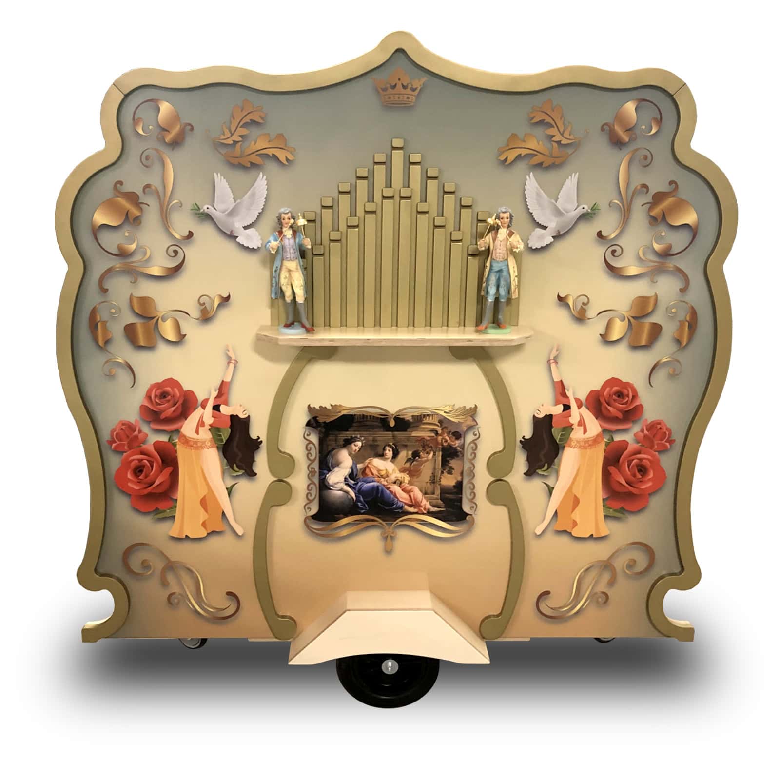 Het orgel is leverbaar in de maten 180 x 120 cm (artikel BE00796) of 180 x 140 cm (artikel BE00797). Er is zelfs een interactieve uitvoering (artikel BE00791), waarbij jij of een bewoner zelf de muziek kunt laten spelen door aan het wiel te draaien. Je kunt dan het tempo zelf bepalen, wat een realistisch beeld geeft van een echt draaiorgel.