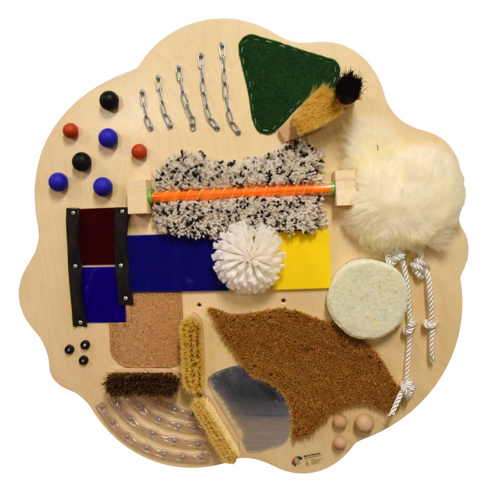 Een kleurrijk organisch gevormd wandbord, doorsnede 100 cm en 360 graden draaibaar. Het bevat vele tastelementen zoals verschillende borstels variërend van hard tot zacht, alsmede enkele geluidsobjecten en een (imitatie-)schapenvacht. Het bord wordt geleverd exclusief bevestigingsmateriaal.
