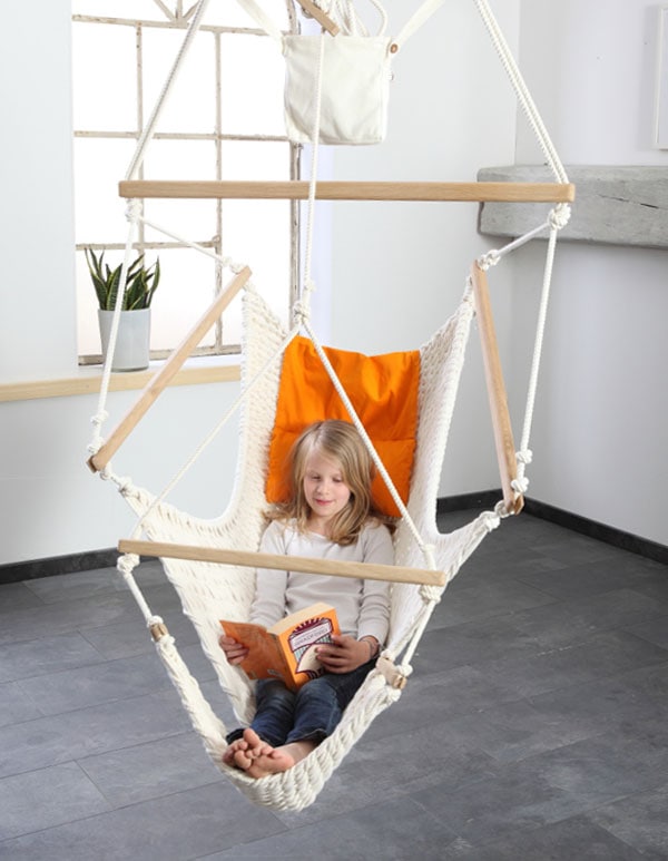 Droomschommel L inclusief universele tas, karabijnhaak, hoogteverstelling en voetendeel. Afmeting 100 x 90 cm. Ophanghoogte min. 180 cm, max 300 cm. Belastbaar tot 150 kg. Let op: wordt geleverd exclusief bevestigingsmateriaal en draaiwartel.