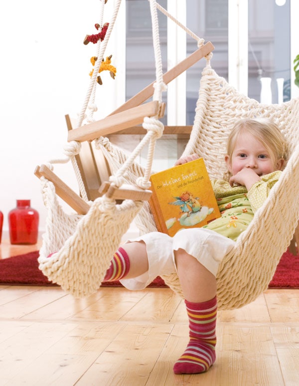 Droomschommel M, Kind. Inclusief universele tas, karabijnhaak, hoogteverstelling en voetendeel. Geschikt voor kinderen van 3 t/m 12 jaar. Belastbaar tot 75 kg, afmeting 85 x 65 cm. Ophanghoogte min. 150 cm, max 250 cm.