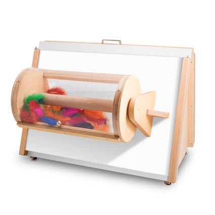 In een grote en veilige acrylaat koker zitten gekleurde veertjes, belletjes en ping-pong balletjes. Het optisch effect is fascinerend. Afmeting: 25 x 50 cm. diameter koker 20 cm. Afmeting van de acitviteitenplaat: 57,5 x 39,5 cm.