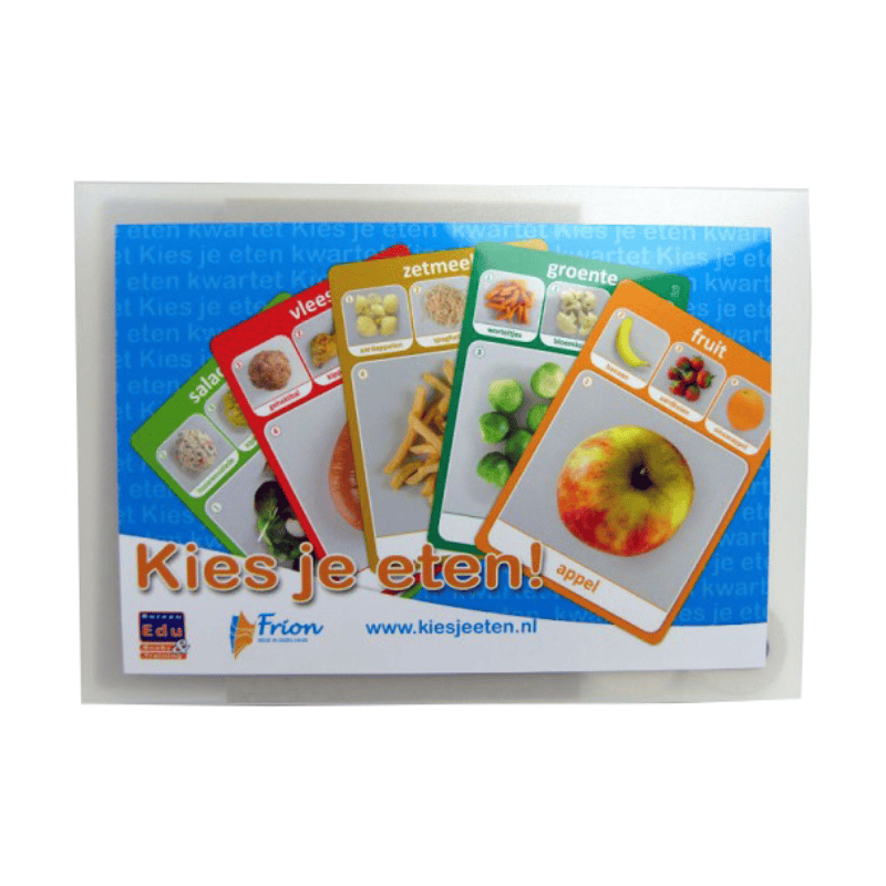 De grote gelamineerde kaarten, verdeeld in 12 categorieën, nodigen uit om te praten over ieders keuze voor de maaltijd, tussendoortjes, eetgewoontes en over een lekker en gezond menu. De dobbelstenen en fiches zorgen voor een speels winelement. Voor deelnemers met leesproblemen, staan er cijfers bij de categorienaam en de foto’s.