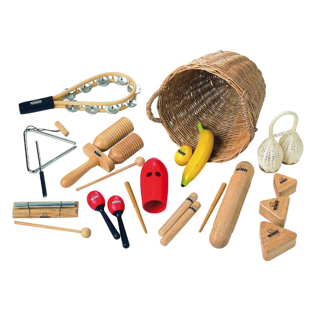 Zeer complete set van instrumenten geleverd in een makkelijk draagbare mand. De set bestaat uit: 1 clave, 1 tamboerijn, 1 triangel, 1 agogo, 3 shakers, 1 caixixi, 1 guiro, 1 mini-guiro, 1 ei shaker, 2 ei maracas, 1 banana shaker, 1 klokkenspel