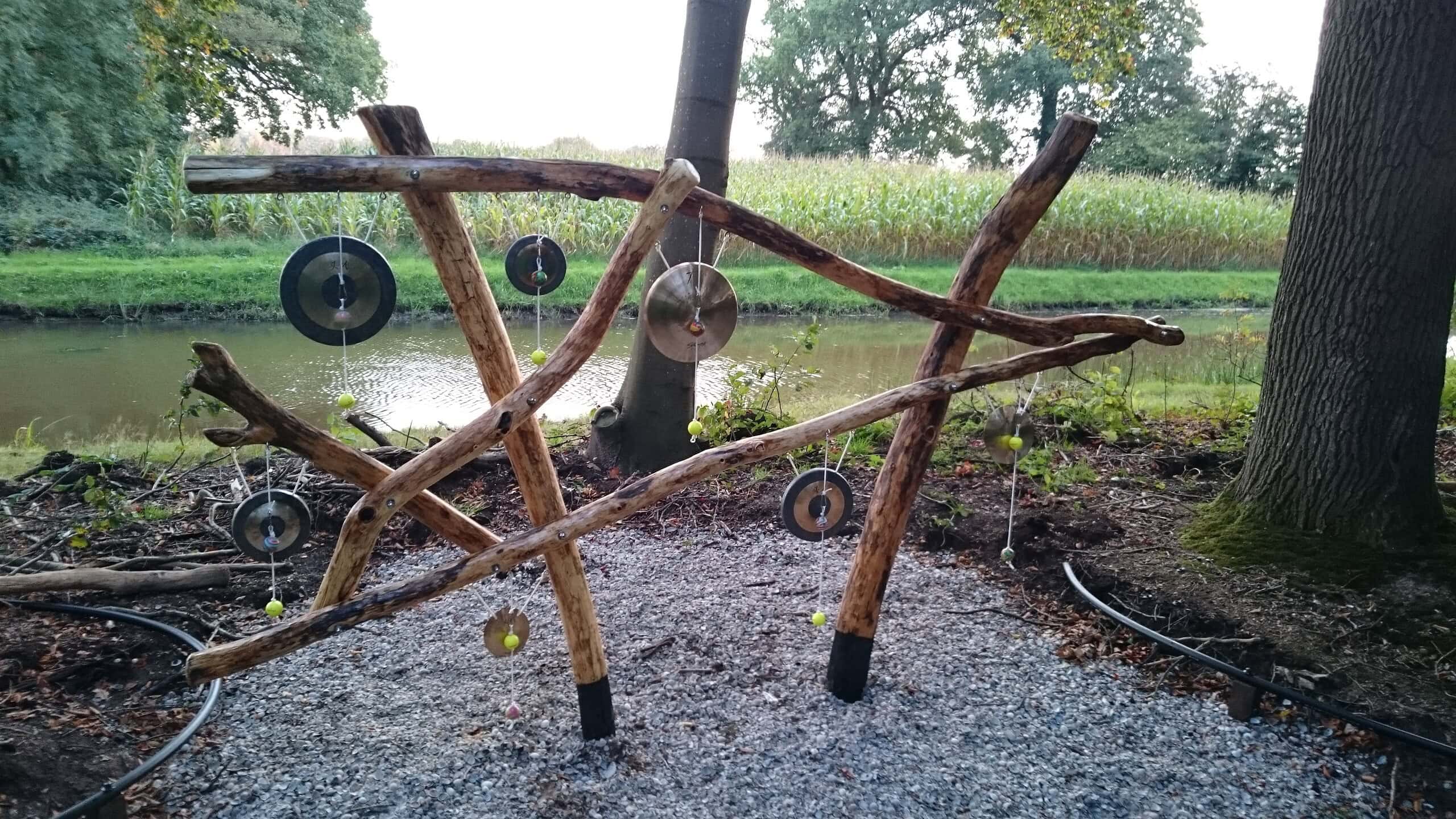 Samenspel van mooi gevormde Robinia stammen, waartussen zeven gongen zijn opgehangen. De kloppers hebben een harde en een zachte kant waarmee de geluidsintensiteit variabel is.