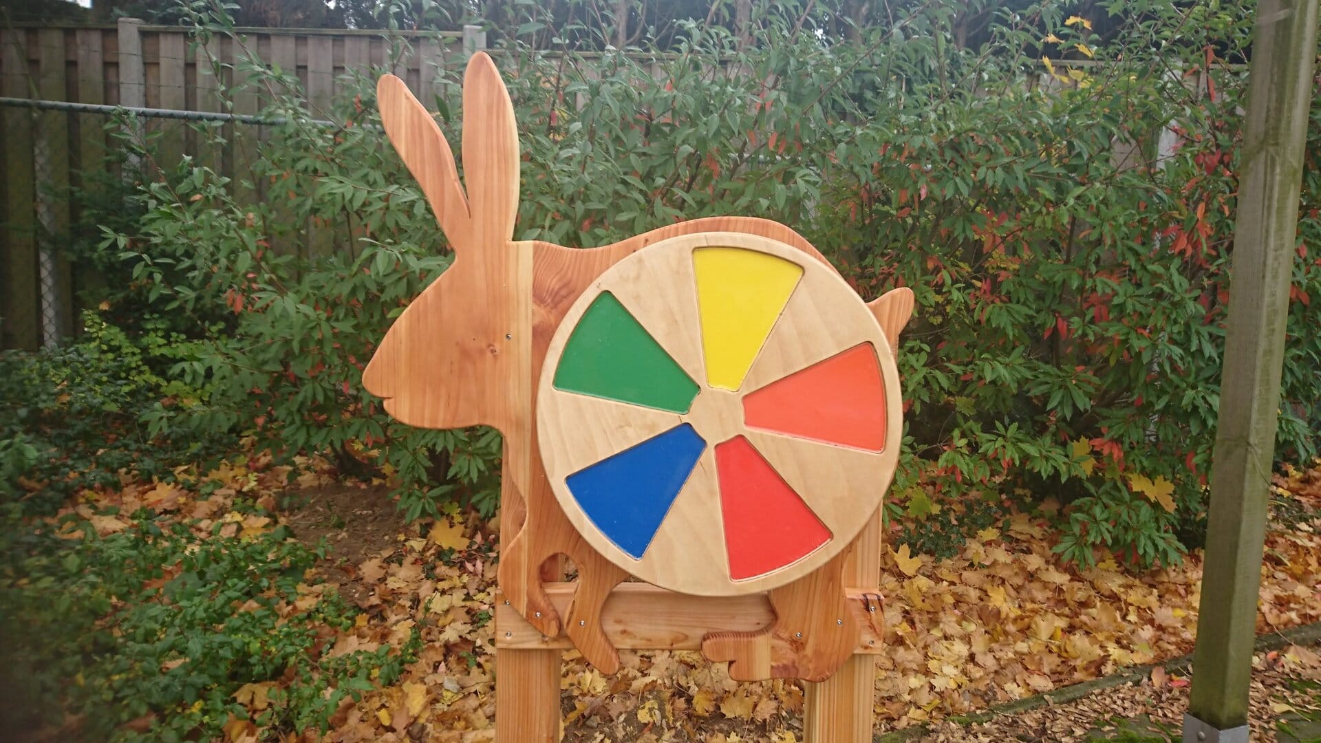 Een mooie, vrolijke kleurendraaier, gemonteerd op een achterplaat van Douglas hout (afm. 80 x 80 x 15 cm) Maak uw keuze uit een egel, konijn of iuil (s.v.p. bij bestelling aangeven). De prijs is inclusief palen, maar exclusief plaatsingskosten. Vraa…