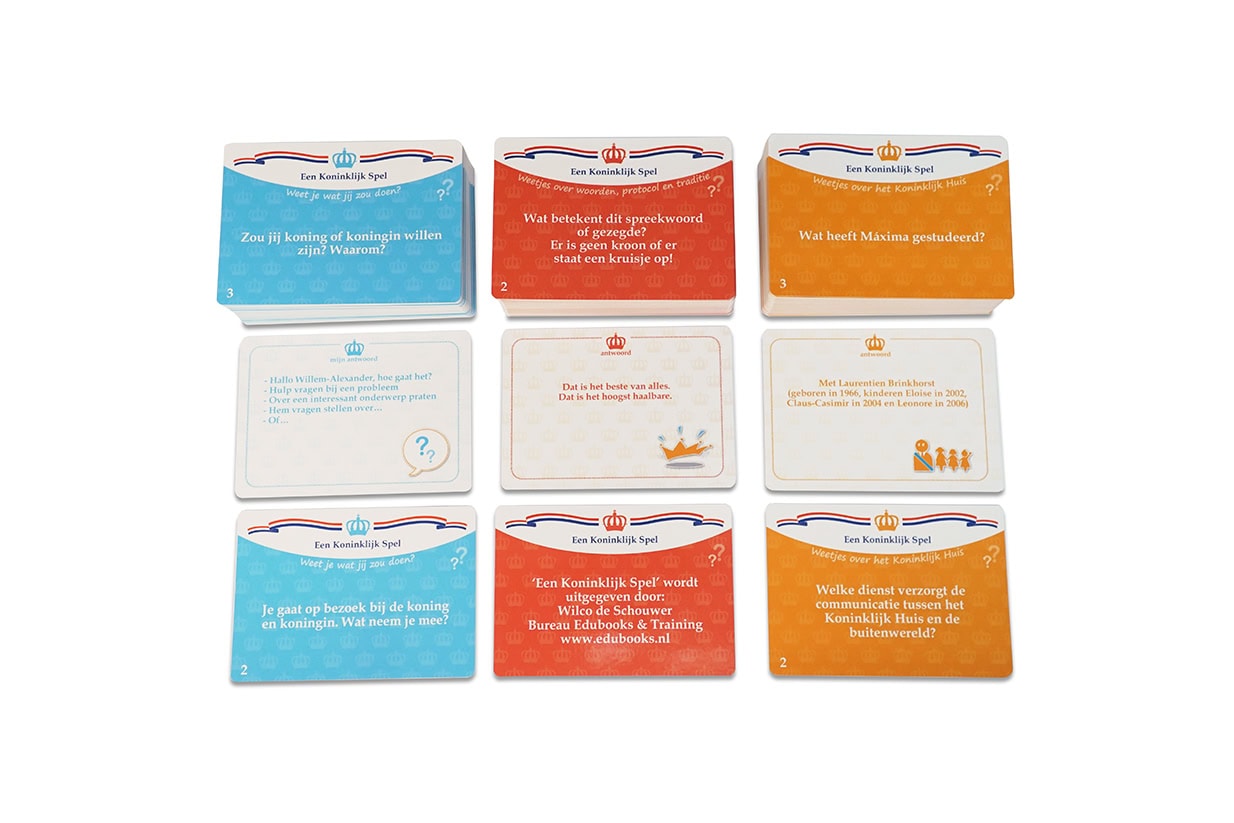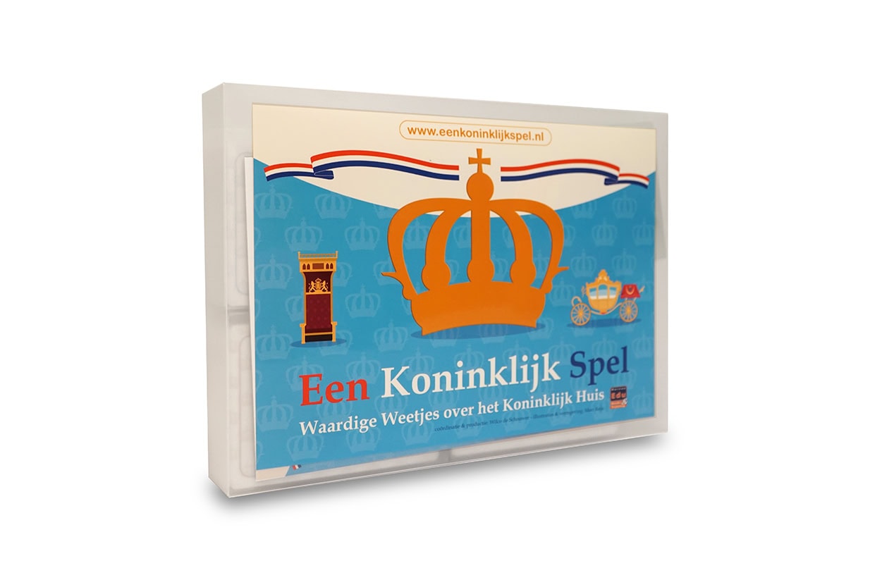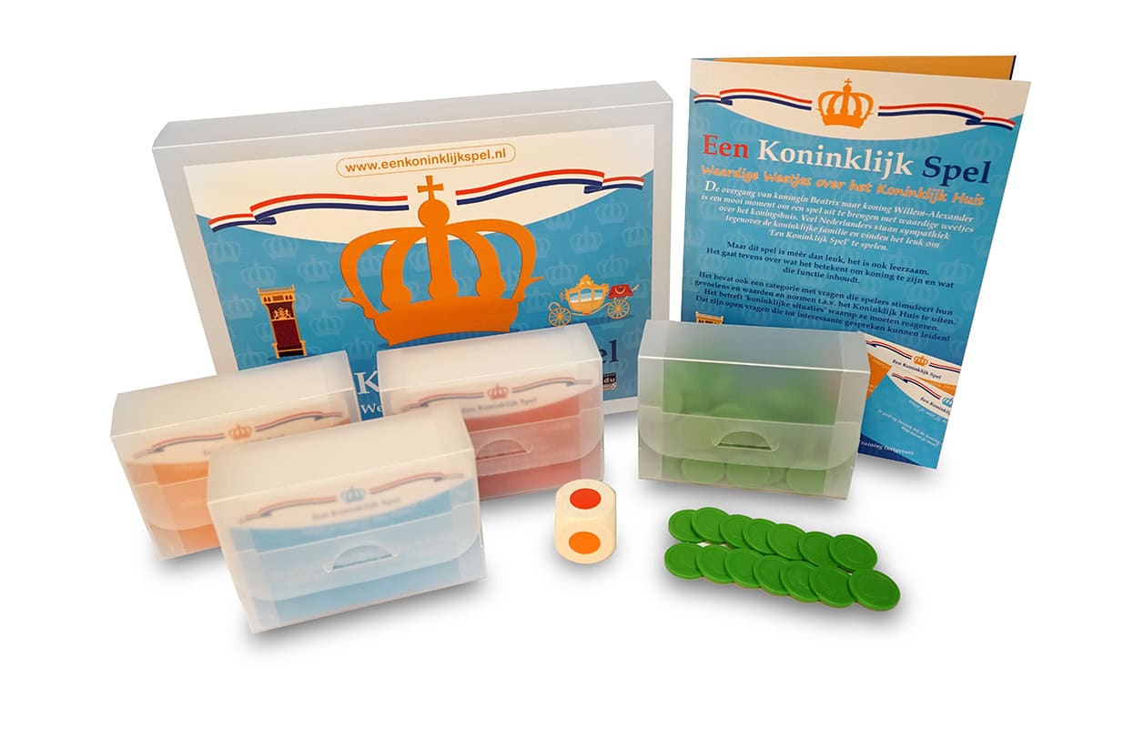 Ter ere van de inhuldiging van prins Willem-Alexander tot koning werd dit spel met weetjes over het Koninklijk Huis gemaakt. Ontdek wat het betekent om koning of koningin zijn. En hoe ‘koninklijk’ ben je zelf? Hoe zou jij op leuke of lastige ‘koninklijke’ situaties reageren? De kaarten brengen mensen op een speelse manier in gesprek over alles wat met het Koninklijk Huis te maken heeft. Zo komen ervaringen, meningen en waarden en normen naar boven. Elk vraag en antwoord kan tot een nieuw interessant gesprek leiden. Een Koninklijk Spel leidt tot vorstelijke gesprekken, ontdek het zelf! De spelkoffer bevat het volgende: 210 spelkaarten (drie doosjes met ieder 70 kaarten) met vragen, afbeeldingen én antwoorden. Kleurendobbelsteen met drie kleuren. Twee doosjes met samen oranje koningsfiches. Handleiding met informatie en spelregels.