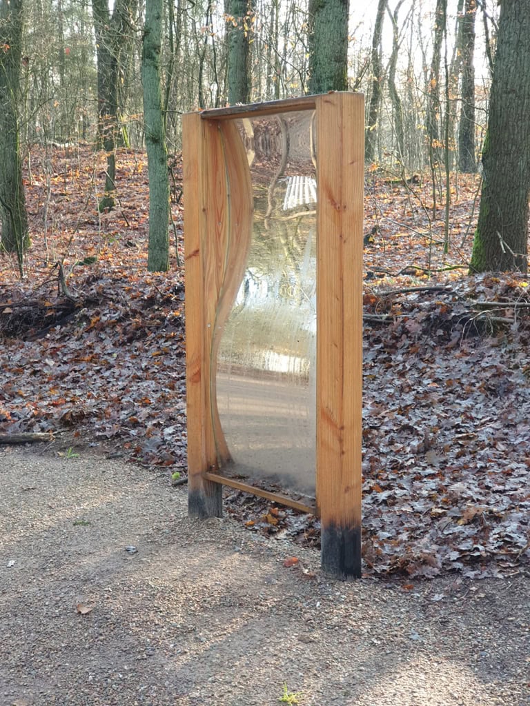Deze mooie lachspiegel op palen is vervaardigd uit (inlands) eikenhout met een slagvaste polycarbonaat spiegelplaat.