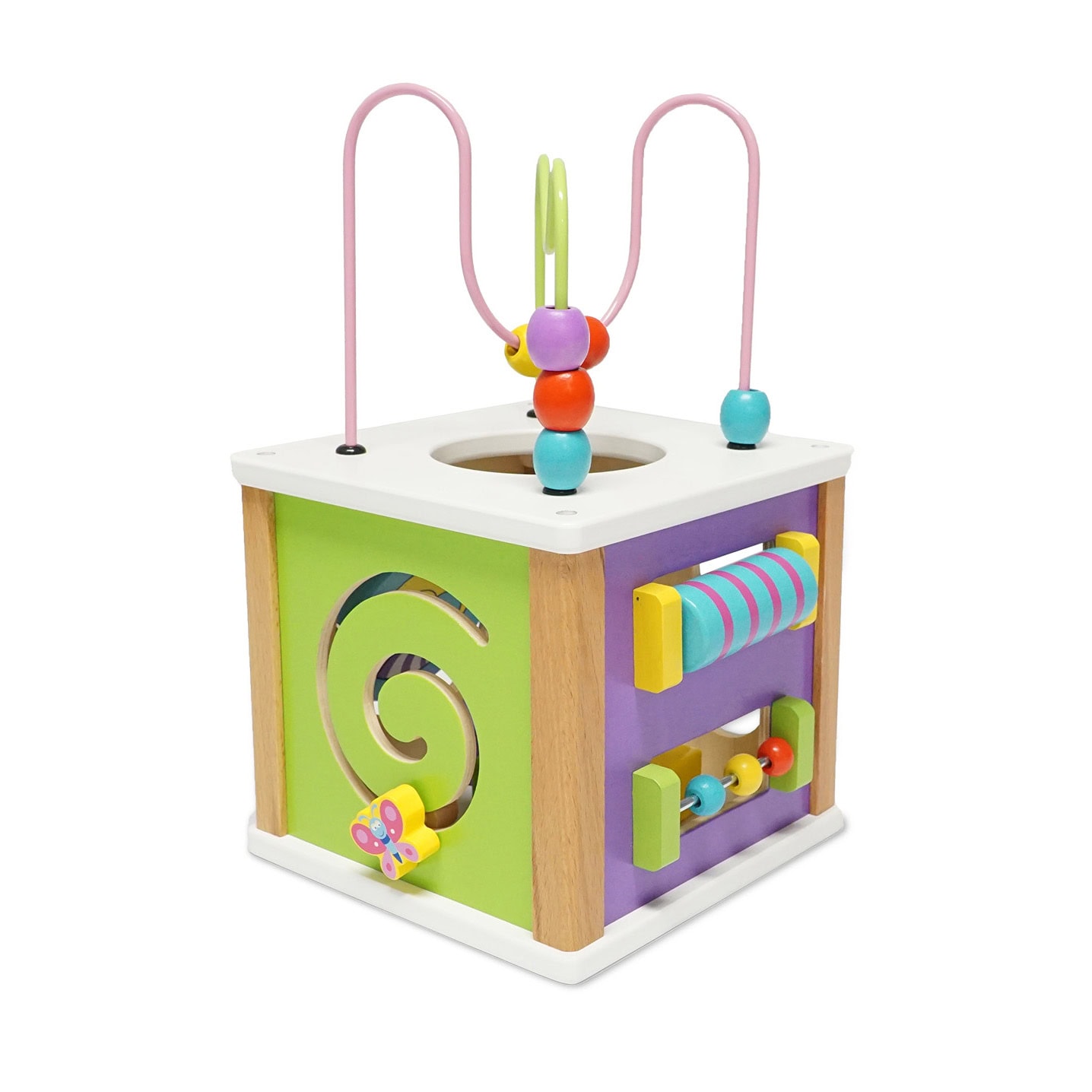 Met een klein doolhof, zon en maan, kralen en cilinder, puzzel in 4 stukken. Kortom veel plezier voor weinig geld. 20 x 20 x 33,5 cm.