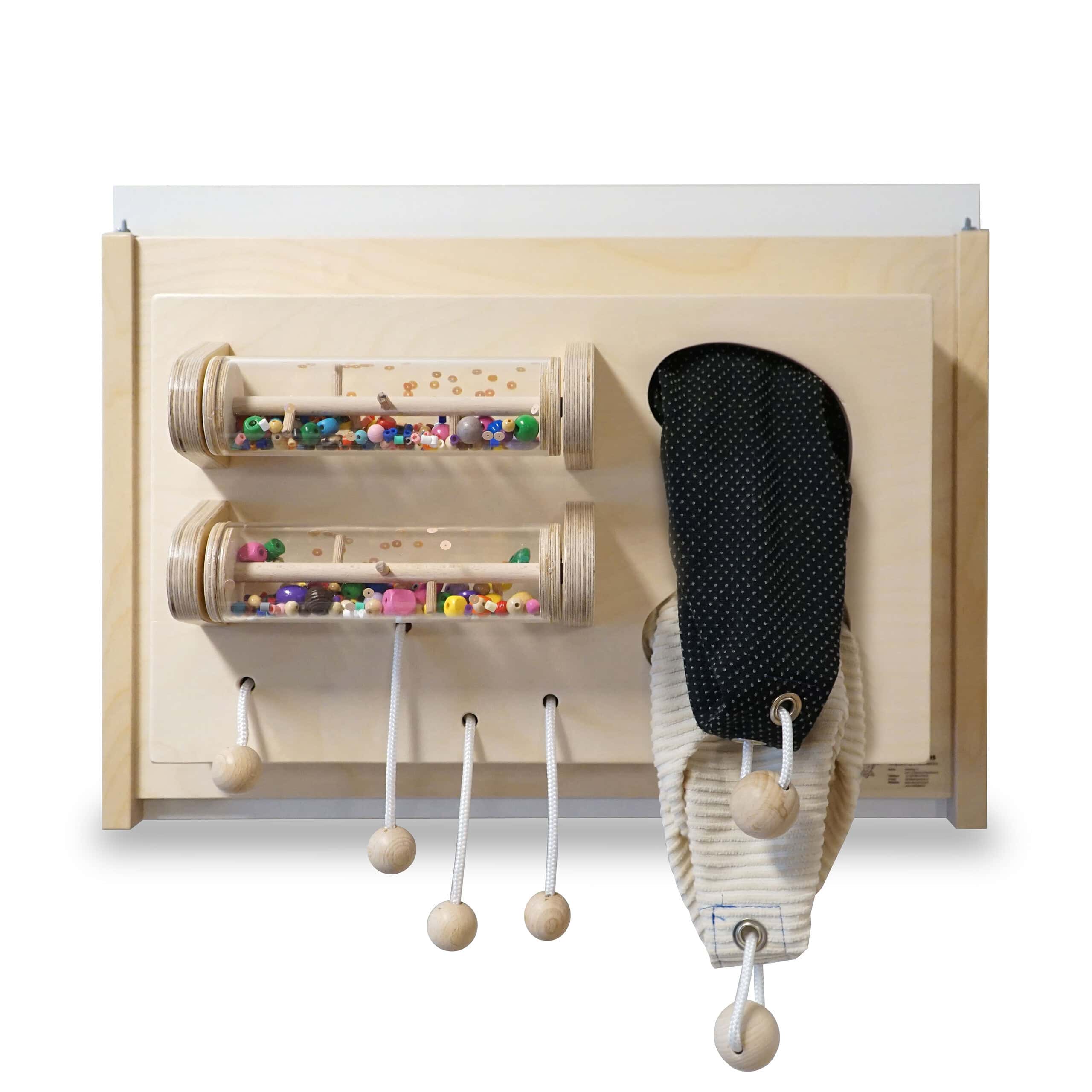 Deze plaat geeft een actie-reactie effect. Door aan onderdelen te trekken, te draaien of te voelen vind je vanzelf een beloning. Naast de tastzin wordt ook het visuele aspect geprikkeld. Tast, kleur, geluid en beweging staan centraal. De spelplaten zijn in het wandinschuifframe te schuiven (apart te bestellen) en daardoor gemakkelijk uitwisselbaar. De frames kunnen aan een muur, maar ook aan een mobiele activiteitentafel geplaatst worden, zodat de spelplaten bijna overal te gebruiken zijn.