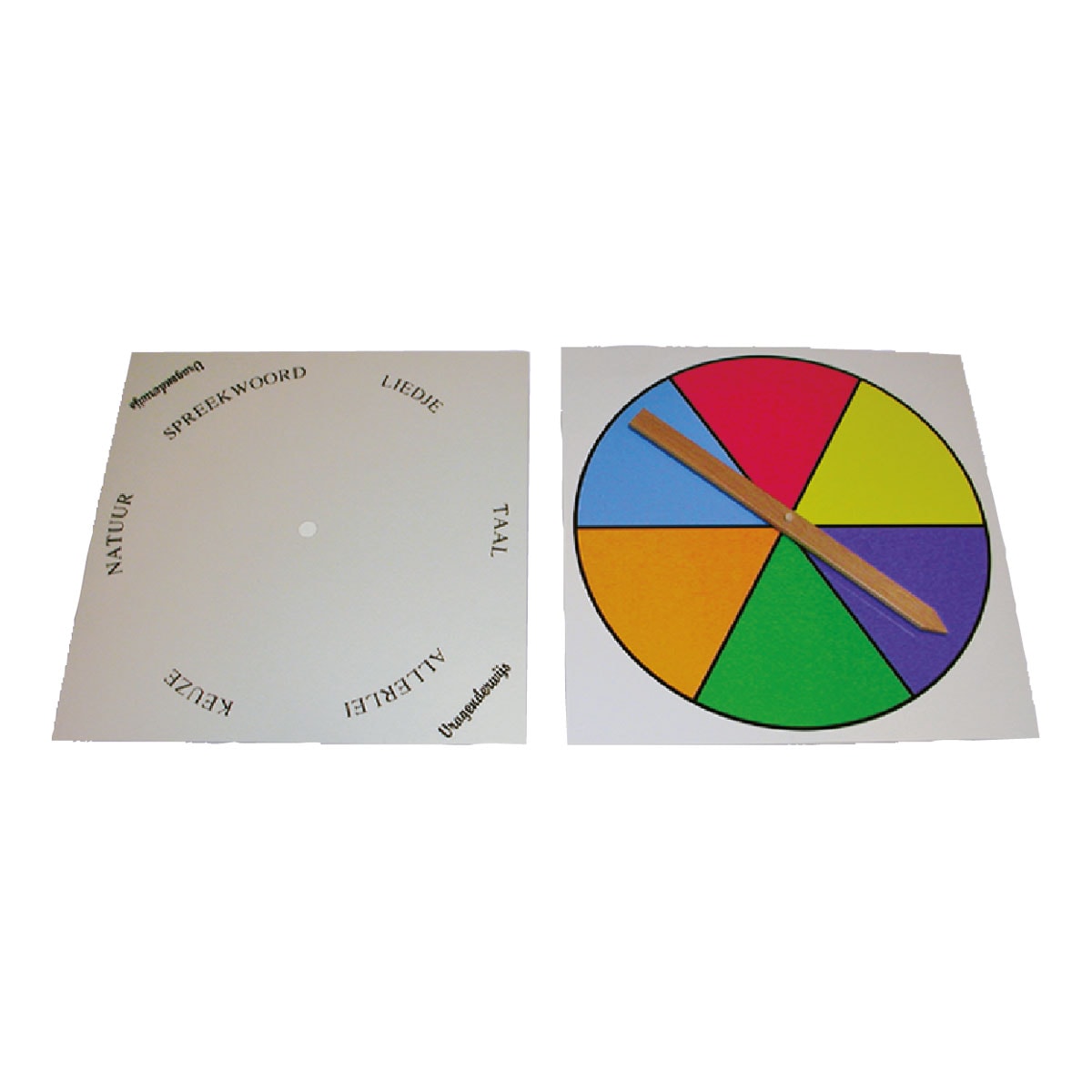 Dit oplegvel wordt op de wijzerplaat gelegd en geeft de Vragenderwijsthema’s Spreekwoorden, Liedjes, Natuur, Taal en Allerlei aan. Zo vormen zij een duidelijk extra spelelement bij de geheugenspellen Vragenderwijs Rood en Blauw.