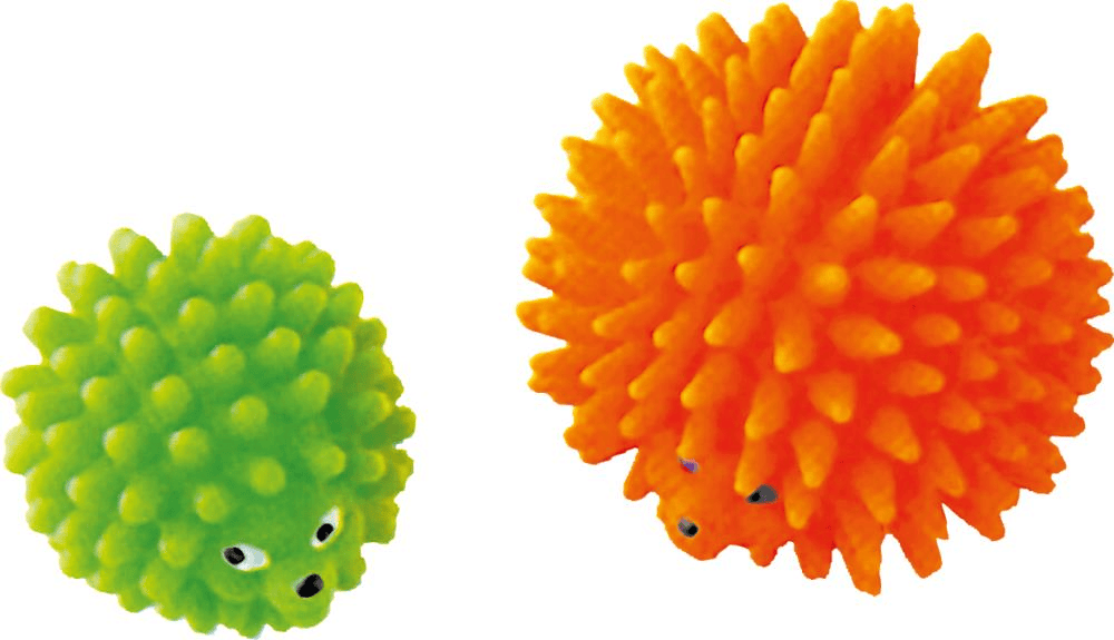 Twee egels van zacht vinyl met piepgeluid wanneer ze geknepen worden.