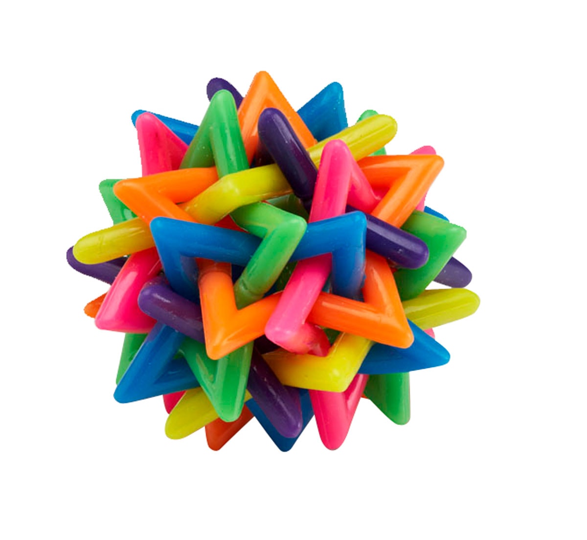 Kleine gekleurde rubberen bal om in te knijpen. Klein genoeg om in de palm van de hand te leggen. De bal is in één of meerdere kleuren uitgevoerd, dit kan variëren.