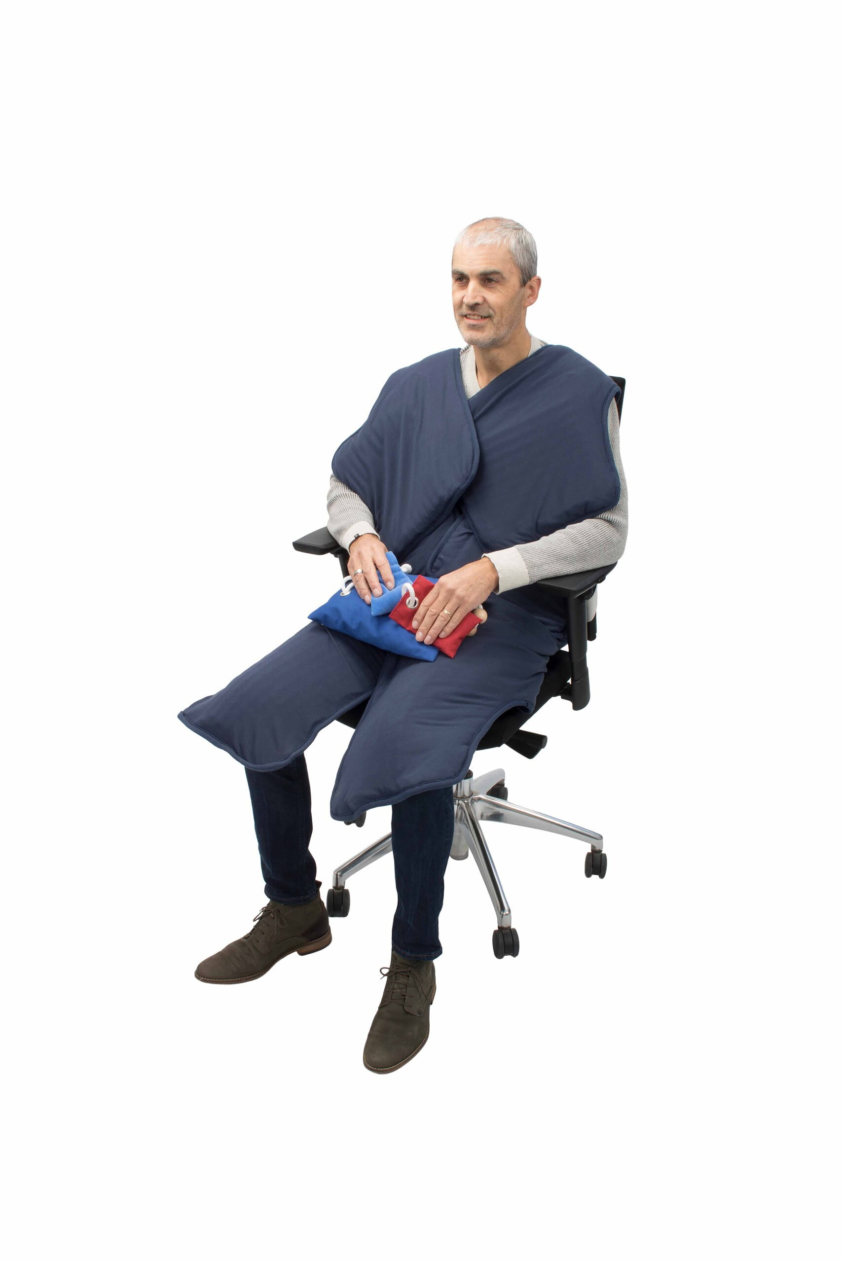 Rustdeken in kwaliteit 1010 gewatteerd, licht verzwaarde zijstroken aan bovenbeen, taille en schouder, past op elke zetel met voldoende hoge rugleuning.