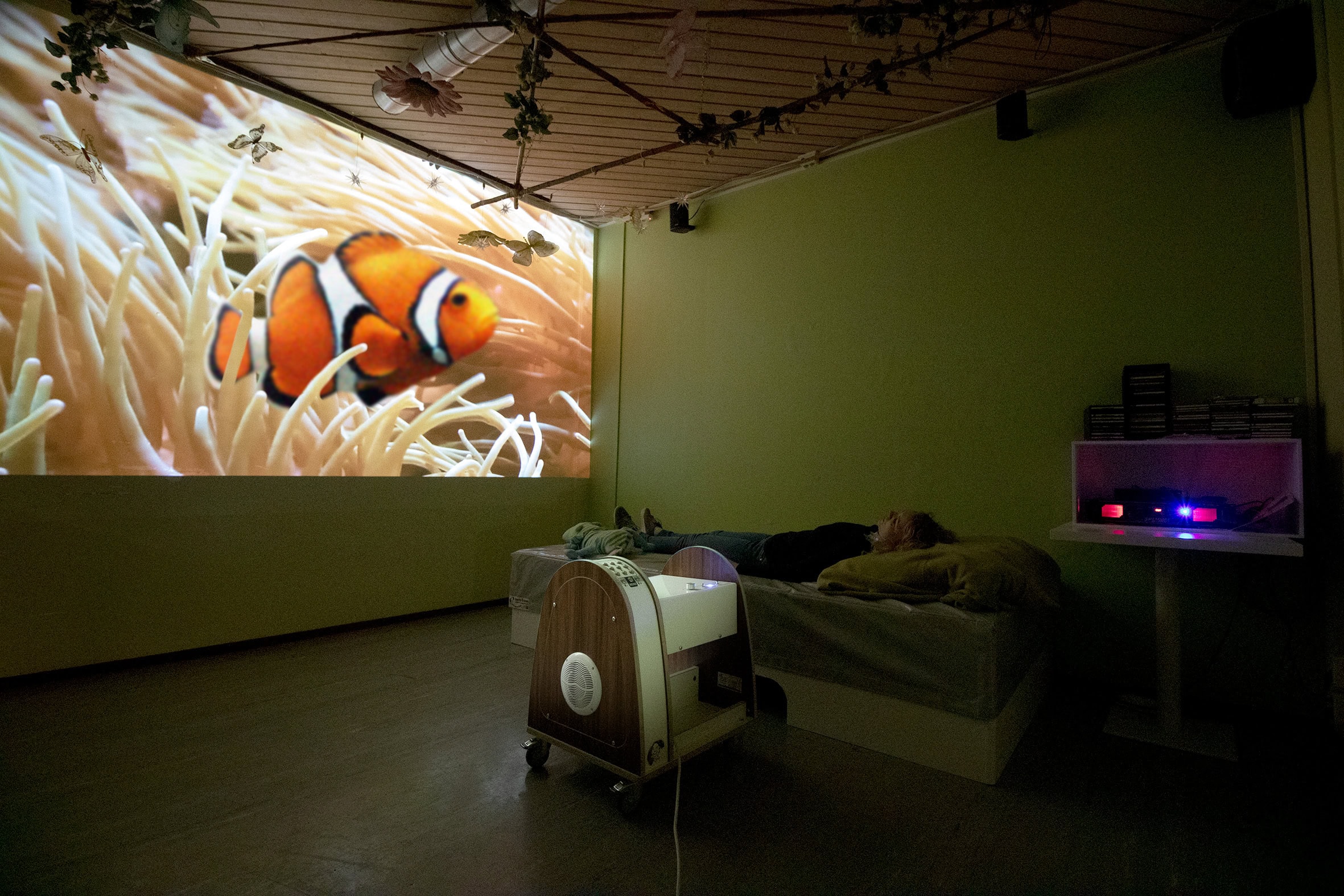 De SensiView is een mobiele beleef unit, die projecteert op het plafond of de wand. Via kamervullende projecties met herkenbare beelden worden de zintuigen van je bewoners geprikkeld. Bijpassend geluid of muziek wordt afgespeeld op het door jezelf ingestelde volume.