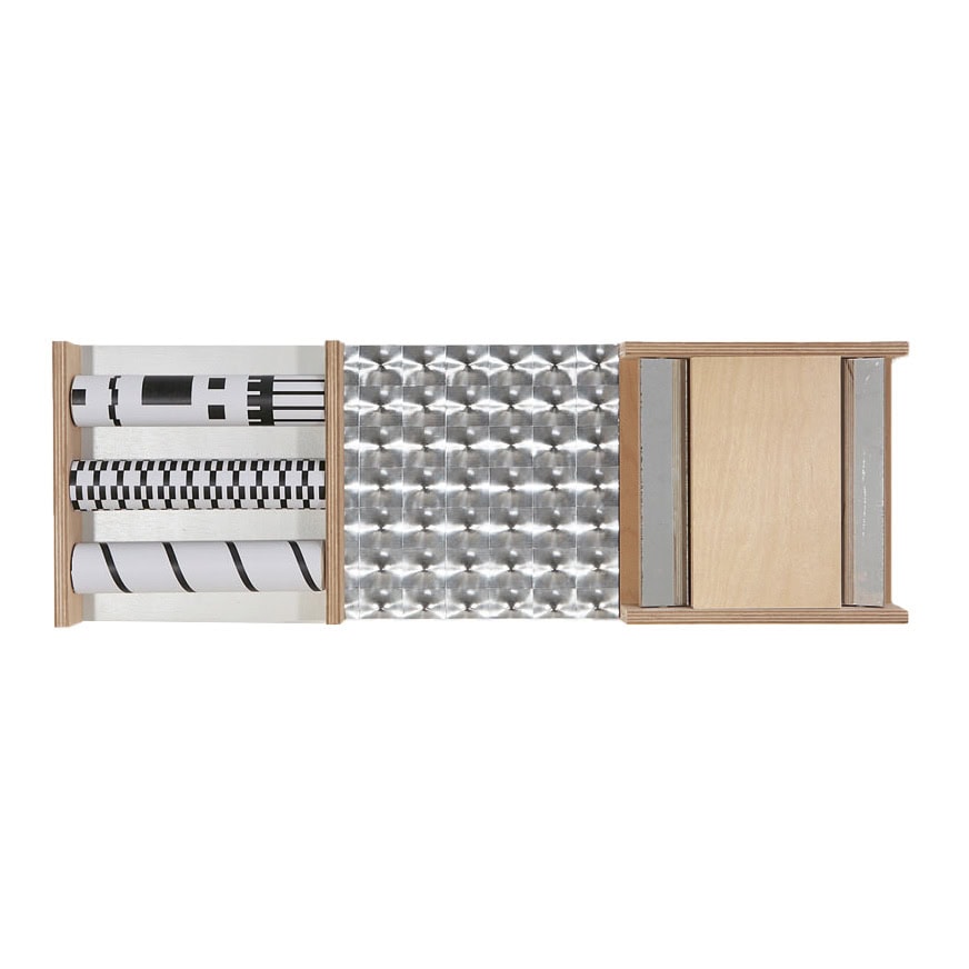 - Paneel met drie optische rollen van berkenhout, beplakt met vrolijke folie. Door het draaien ontstaan er telkens nieuwe vlakken en lijnen.