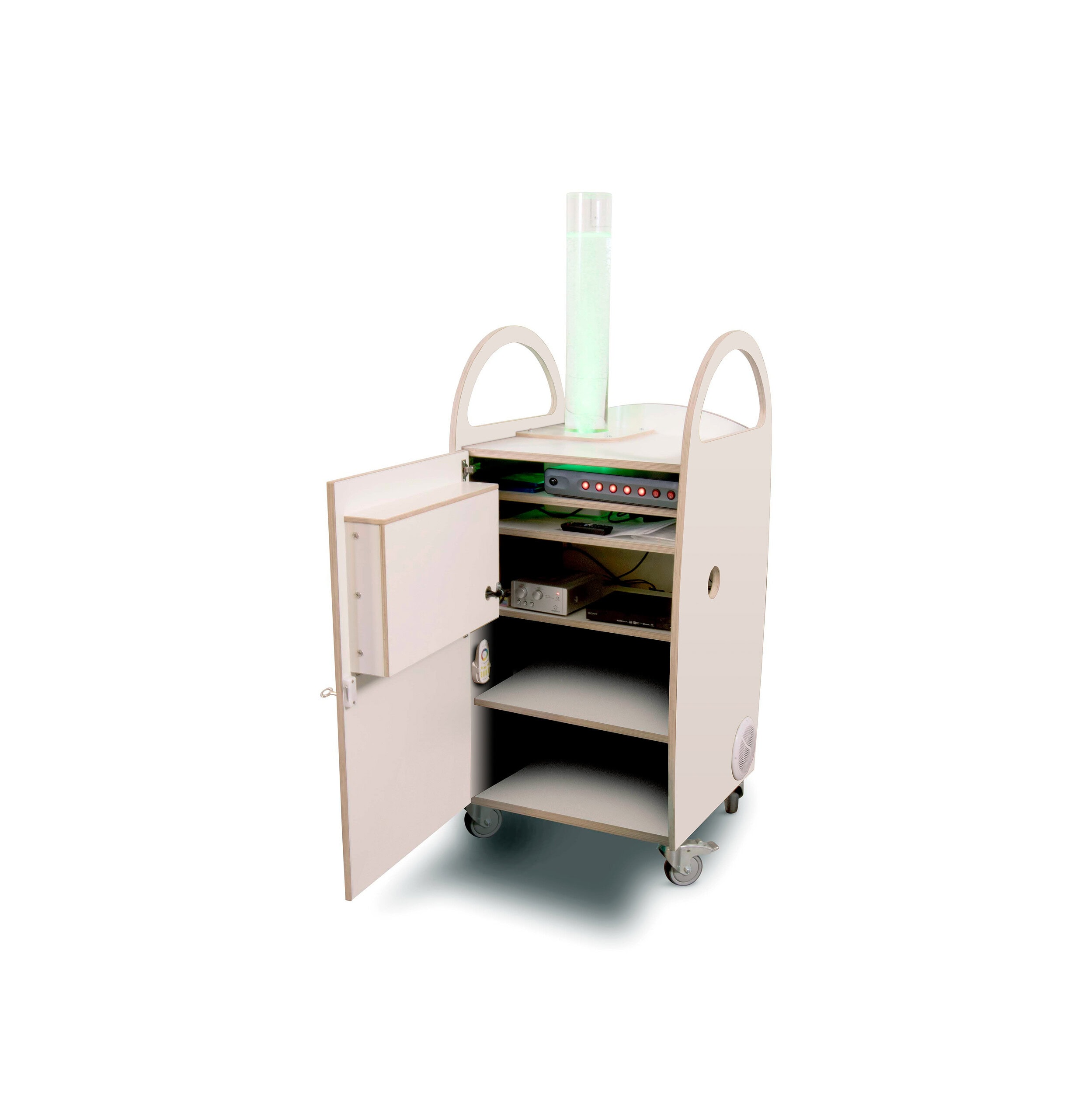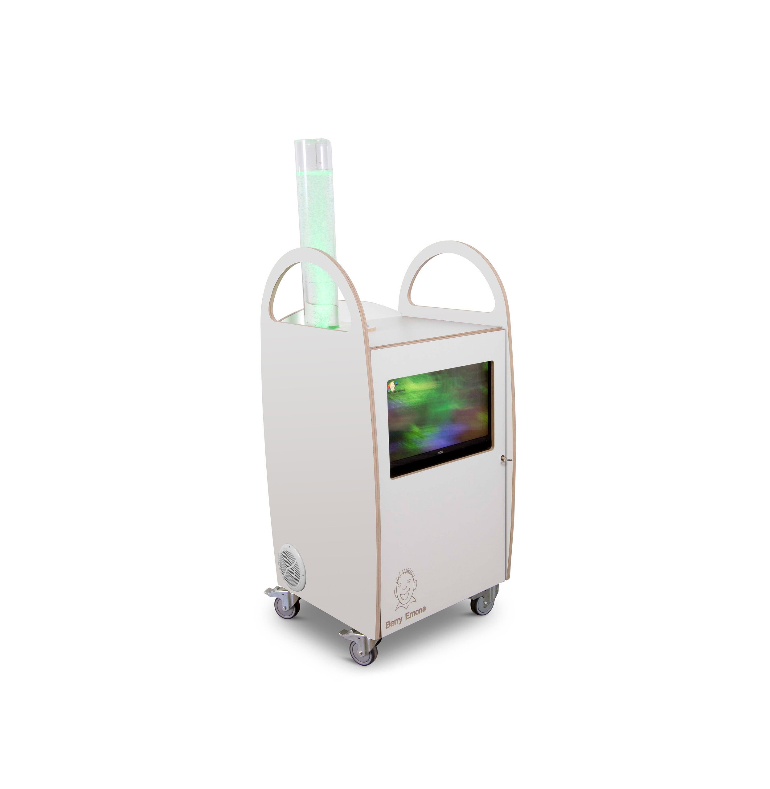 De snoezelkar Alex is een uitgekiende snoezelkar met bubbelunit tegen een hele mooie prijs, uitgevoerd in wit HPL. We hebben de kar uitgerust met muziek en beeld door de Blu-ray speler en het 21 inch scherm dat in de deur is geïntegreerd. Een Blu-Ray wordt standaard meegeleverd. U kunt de snoezel Blu-Ray"s gebruiken, maar ook eigen DVD’s, een film of zaken die u op een USB-stick, iPod of telefoon bij u draagt. Een foto album voor geheugentraining is dus ook mogelijk, u kunt foto’s die zijn aangeleverd door bijvoorbeeld familie rustig doorbladeren. Het scherm is goed zichtbaar vanuit een rolstoel want het heeft een elektronische kijk-hoek instelling. U kunt de Alex veilig afsluiten met een slot.