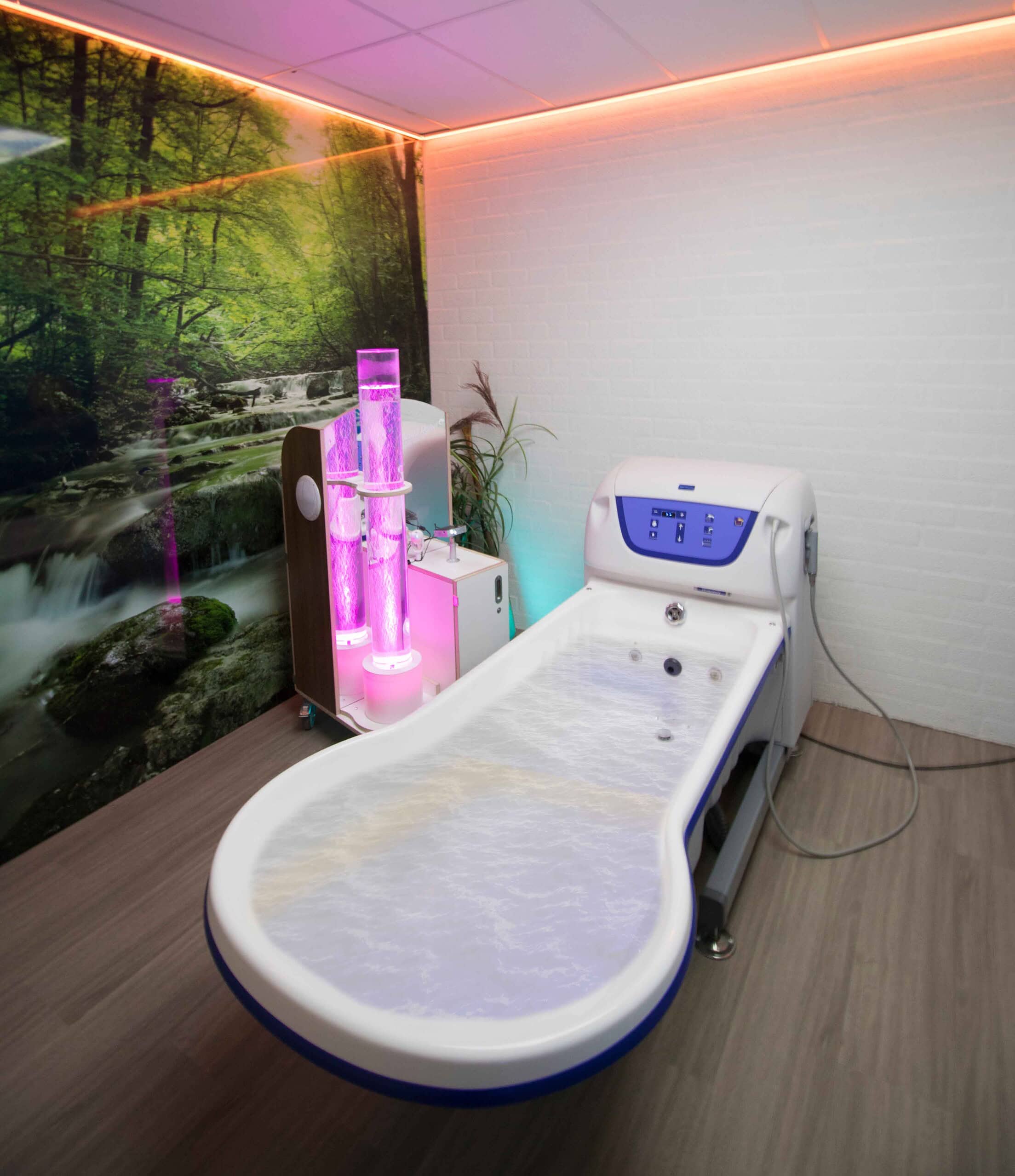 Een prachtige bubbelunit staat te midden van spiegels. Hij is instelbaar qua kleur, programma, snelheid van de kleurwisseling en lichtintensiteit. Tot slot is er gedacht aan een aromastream om een geur-element toe te voegen. Dat kan uiteraard ook met badolie worden bereikt. Alle elementen zijn los schakelbaar, dus je kunt de prikkels goed doseren.