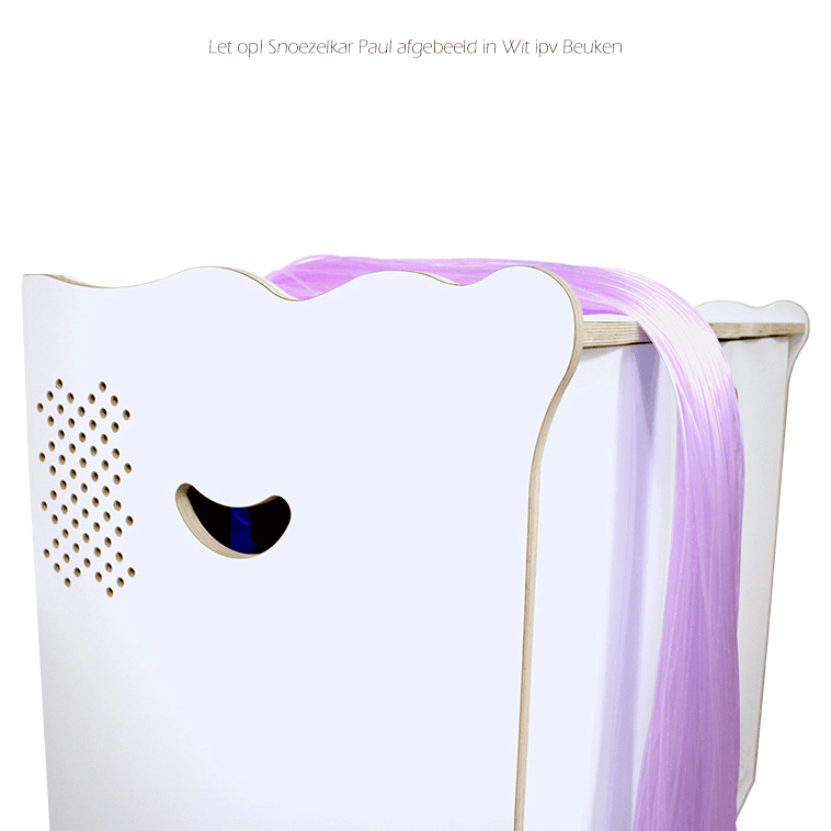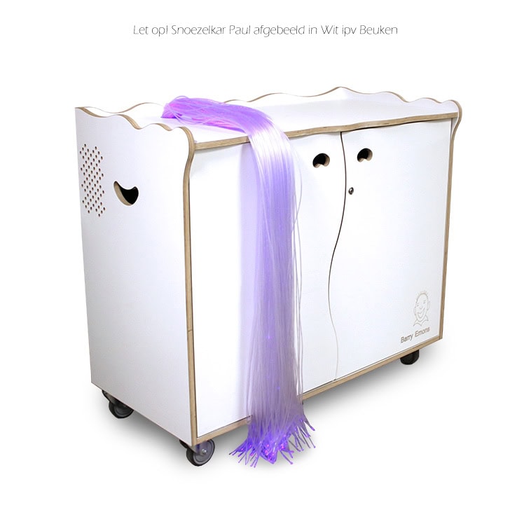 De Snoezelkar Paul is een schitterend afgewerkte kast op wielen (3 zwenkwielen en 1 bokwiel), voorzien van twee afsluitbare deuren, twee schappen en openingen voor doorvoer van elektriciteitsdraden aan de achter- en bovenzijde. Afmetingen: 124 cm breed, 62 cm diep en 96 cm hoog.