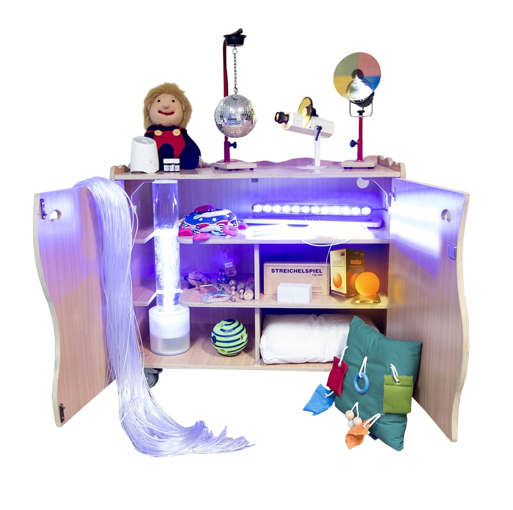 De kar kan worden uitgebreid met een speciaal voor deze kar samengesteld snoezelpakket (BE04938), dat als voordeelbundel verkrijgbaar is. Let op: de afgebeelde kar is in wit uitgevoerd en dient slechts ter illustratie.