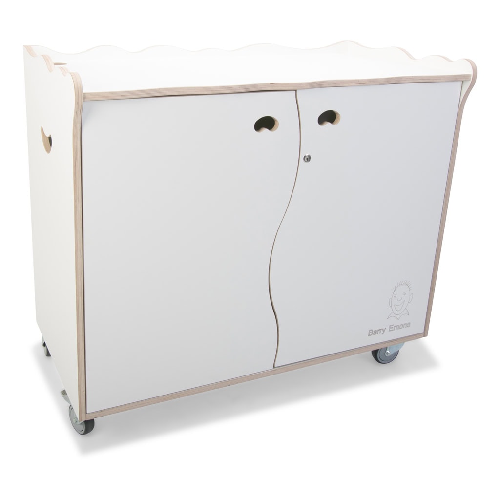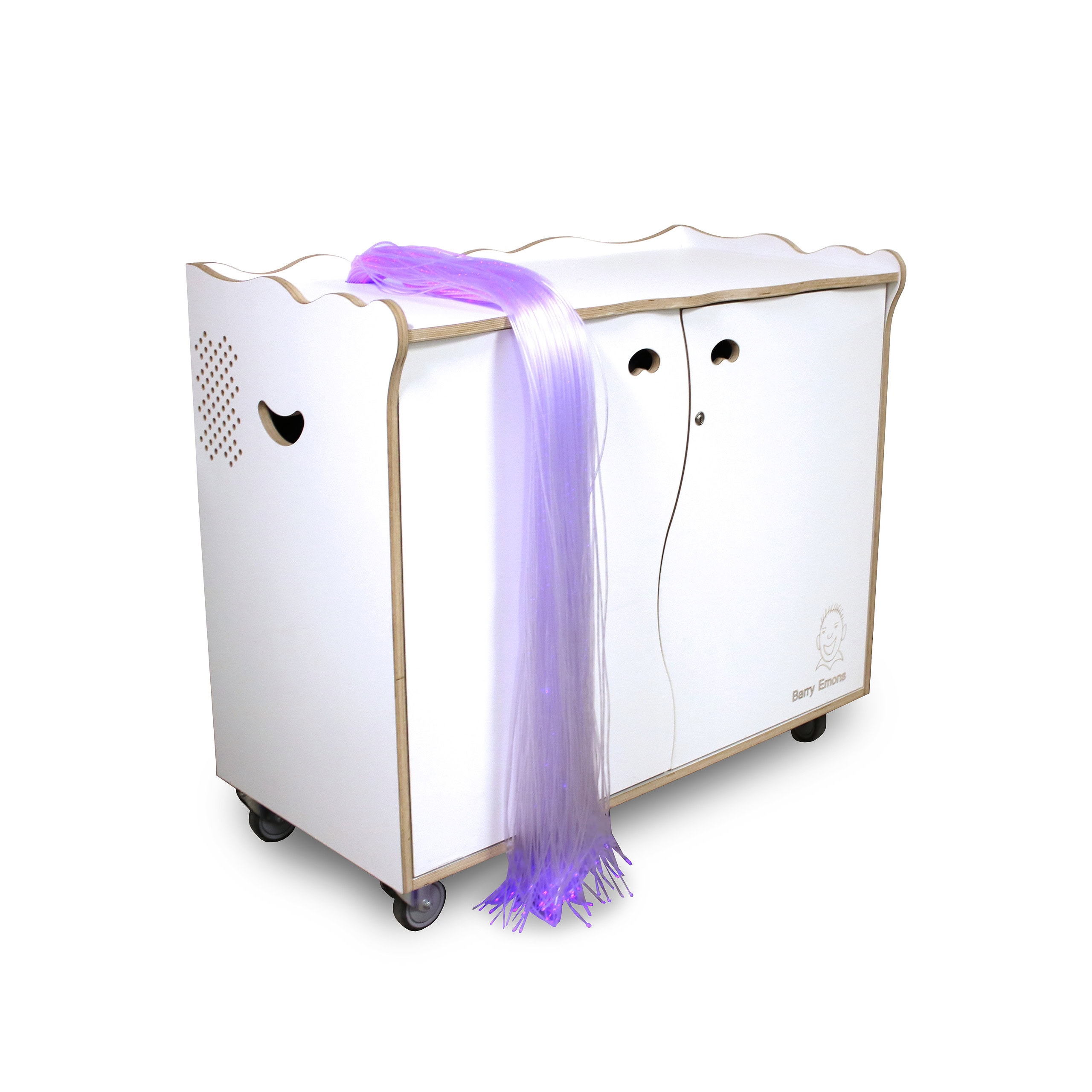 De snoezelkar Paul is een schitterend afgewerkte kast op wielen (3 zwenkwielen en 1 bokwiel), voorzien van twee afsluitbare deuren, twee schappen en openingen voor doorvoer van elektriciteitsdraden aan de achter- en bovenzijde. Afmetingen: 127 cm breed, 61 cm diep en 106 cm hoog.