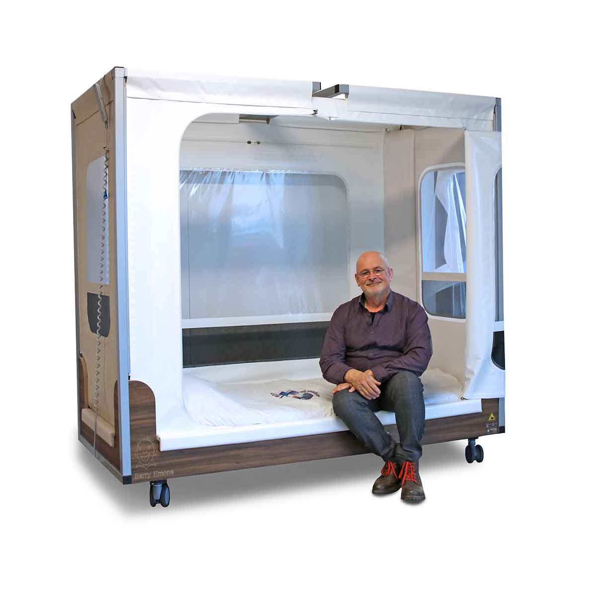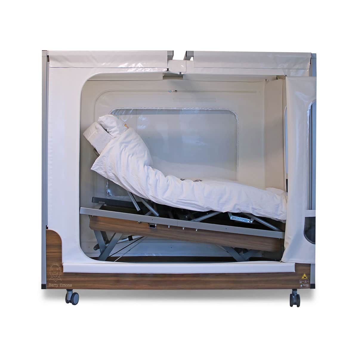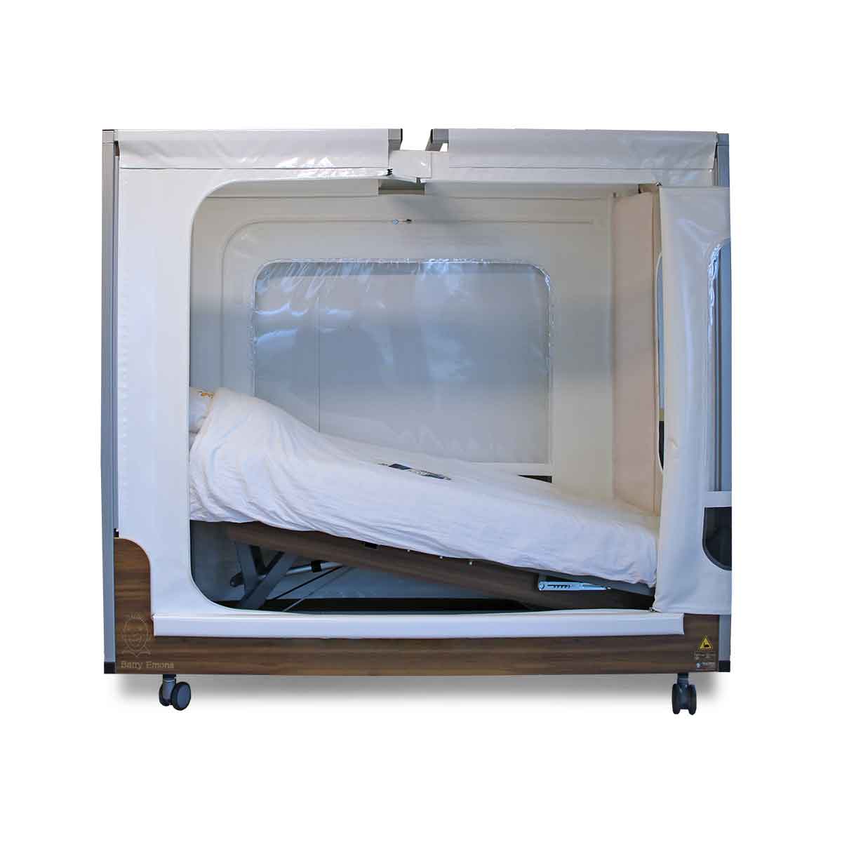 Het bed is standaard aan één lange zijde te openen met een ritssluiting. De voorkant en zijkanten zijn gevensterd met PVC en voorzien van netting voor ventilatie. Een hoog-laagsysteem met driedelig verstelbare bodem is standaard, alsmede de opening in de bovenregel ten behoeve van een plafondtillift. Het bed is op 4 wielen centraal beremd.