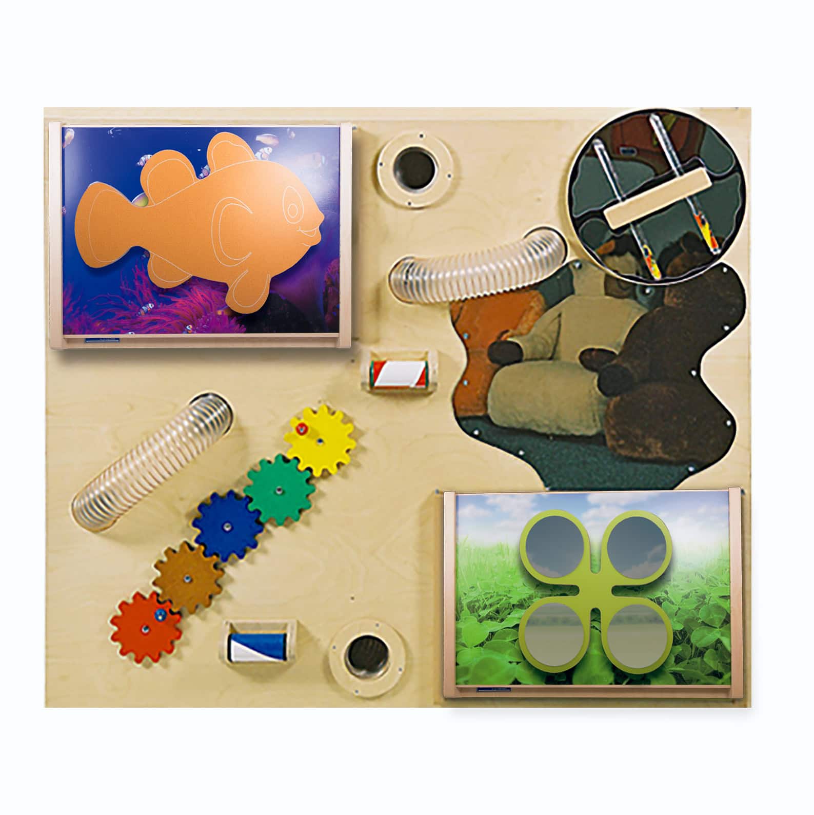 Uiterst degelijke uitvoeringen van tast- en speelelementen. Een prachtige en functionele wandvulling in groeps- en snoezelruimtes.