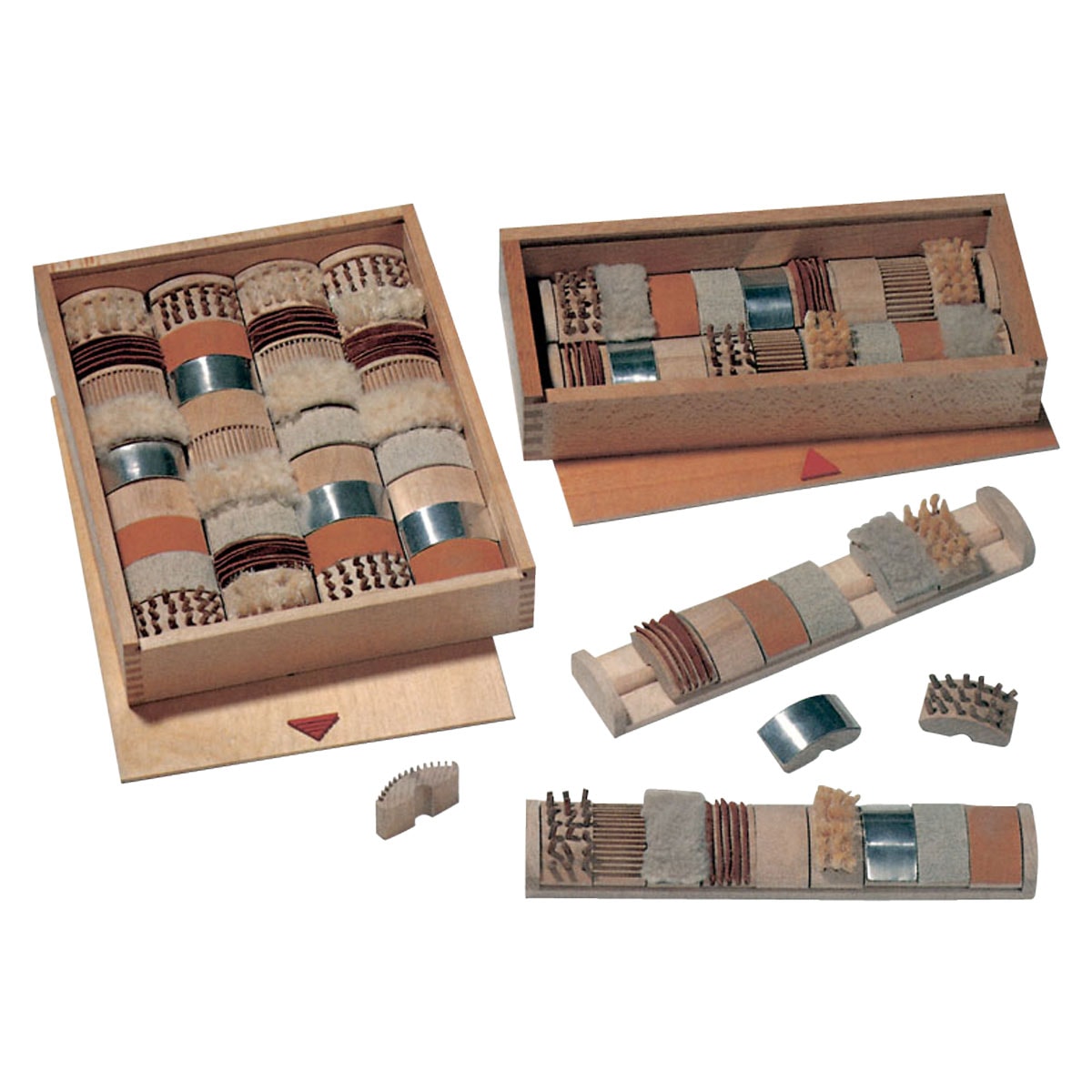 De grote broer van..In een houten kist bevinden zich 4 inleglijsten waarin de tastelementen.passen. De tastelementen hebben allerlei oppervlakten: rubber noppen, leer, aluminium etc. Ook is er sisal, borstels gebruikt. In totaal zijn het 9 tastelementen per inleglijst. De doos met schuifdeksel meet 31 x 24,5 cm.
