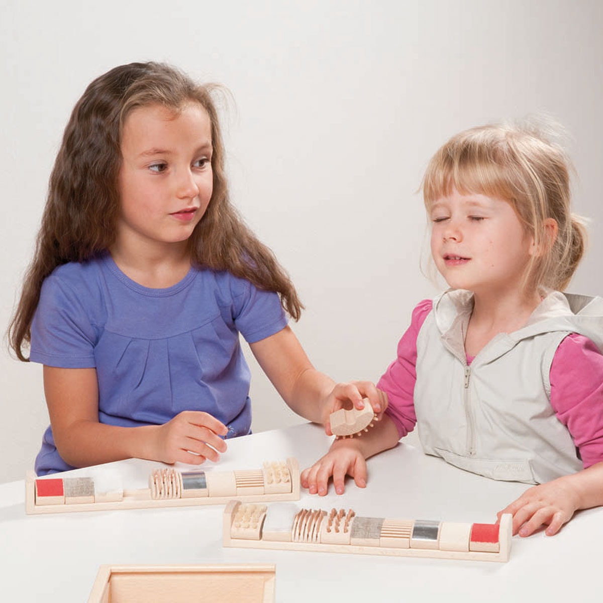In een houten kist bevinden zich 2 inleglijsten waarin de tastelementen.passen. De tastelementen hebben allerlei oppervlakten: rubber noppen, leer, aluminium etc. Ook is er sisal, borstels gebruikt. In totaal zijn het 9 tastelementen per inleglijst. …
