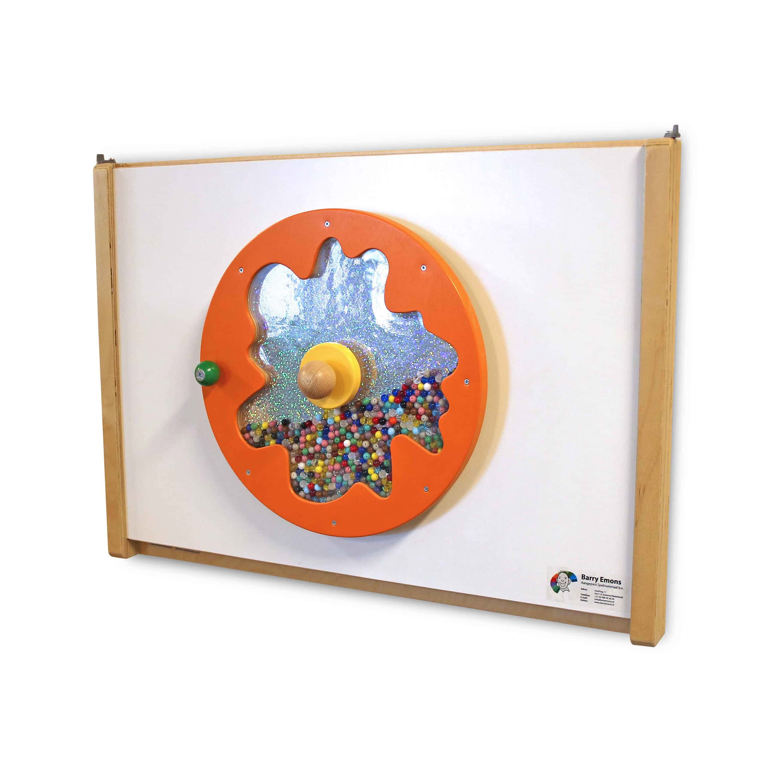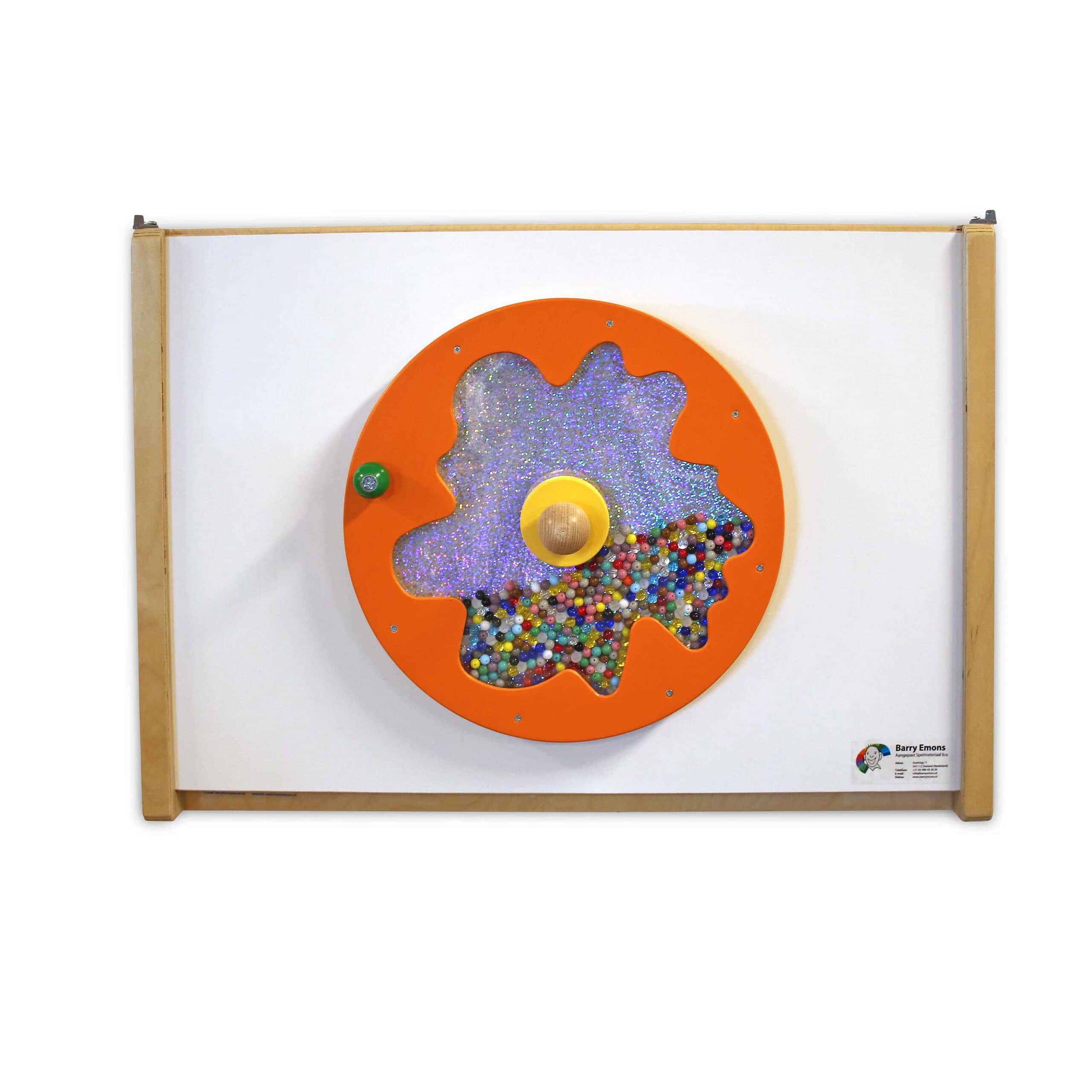 De draaiende schijf op deze speelplaat is zeer uitnodigend door zijn vorm en kleuren. De balletjes in de schijf rollen alle kanten op als er aan gedraaid wordt. Dit levert zowel een visueel als auditief aantrekkelijk schouwspel op. De doorsnede van de schijf is 30 cm.