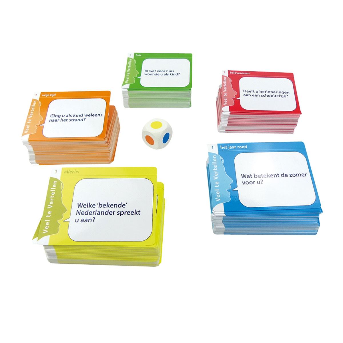 Dit spel is eind 2017 vernieuwd: de spelkaarten zijn groter en mooier vormgegegeven met afgeronde hoeken. Professioneel gelamineerd zitten ze verpakt in een kunststof doosje.  De handleiding is ook uitgebreid. De koffer bevat vijf sets van 60 vragen, in totaal dus 300 vragen. Elk van de vijf thema’s heeft zijn eigen kleur. Gekozen is voor open vragen, waarbij de persoonlijke ervaring voorop staat. Daardoor is er niets fout, zijn alle antwoorden goed. Dat is een wezenlijk verschil met andere spellen. De vragen nodigen uit om veel te vertellen: over de schoonmaak, seizoenen, liefhebberijen, het weer, feestdagen. Enkele voorbeelden: Van welke muziek hou je? Welke sieraden vindt je mooi? Ben je ergens voor aan het sparen? Bent je wel eens naar een museum geweest? Veel te Vertellen is een leuke manier om aandacht te besteden aan gebeurtenissen van alledag en is geschikt voor (bijna) alle volwassenen.