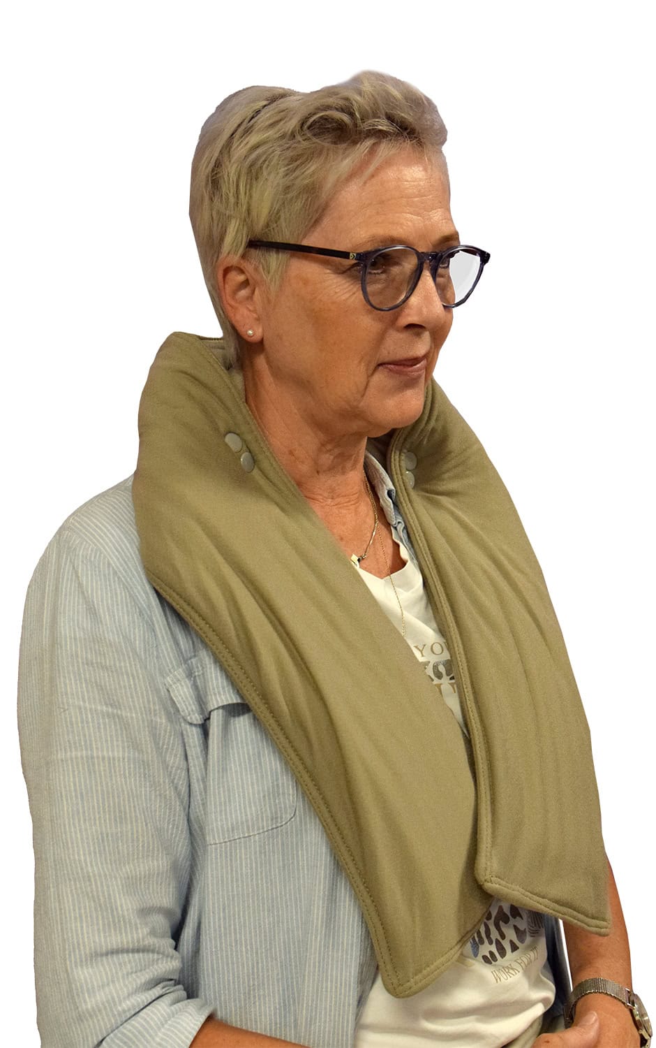 Deze verzwaarde sjaal met drukknopen heeft een afmeting van 29x122 cm en een gewicht van 2,1 kg.