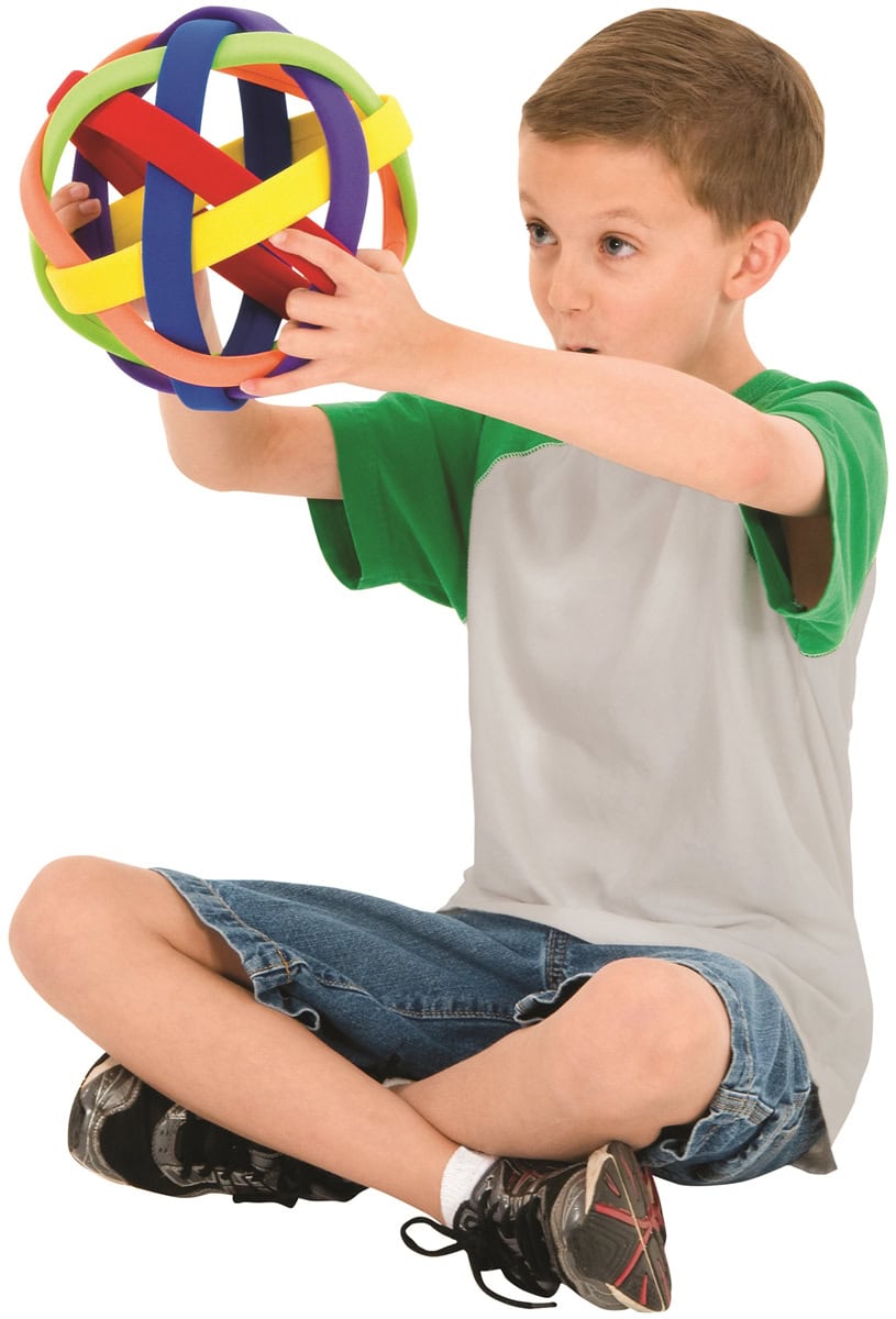 Deze vlechtbal is een ‘opengewerkte’ bal van bijna 20 cm. in doorsnede. Plastic strips, voorzien van een kleurrijke foamlaag, zijn in elkaar gevlochten en vormen zo een bal die makkelijk vast te grijpen is. Dankzij dit ontwerp stuitert de bal nauwelijks.