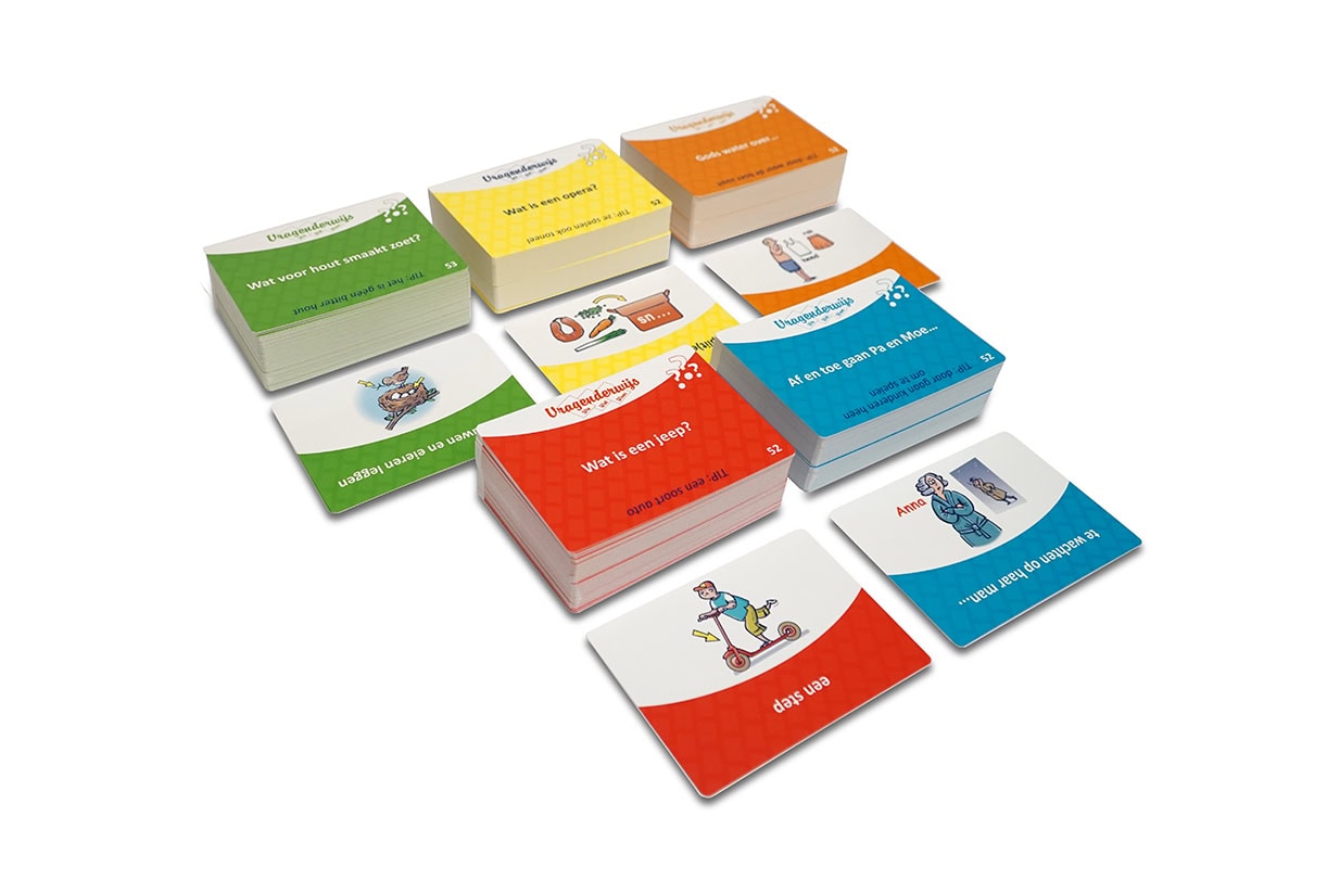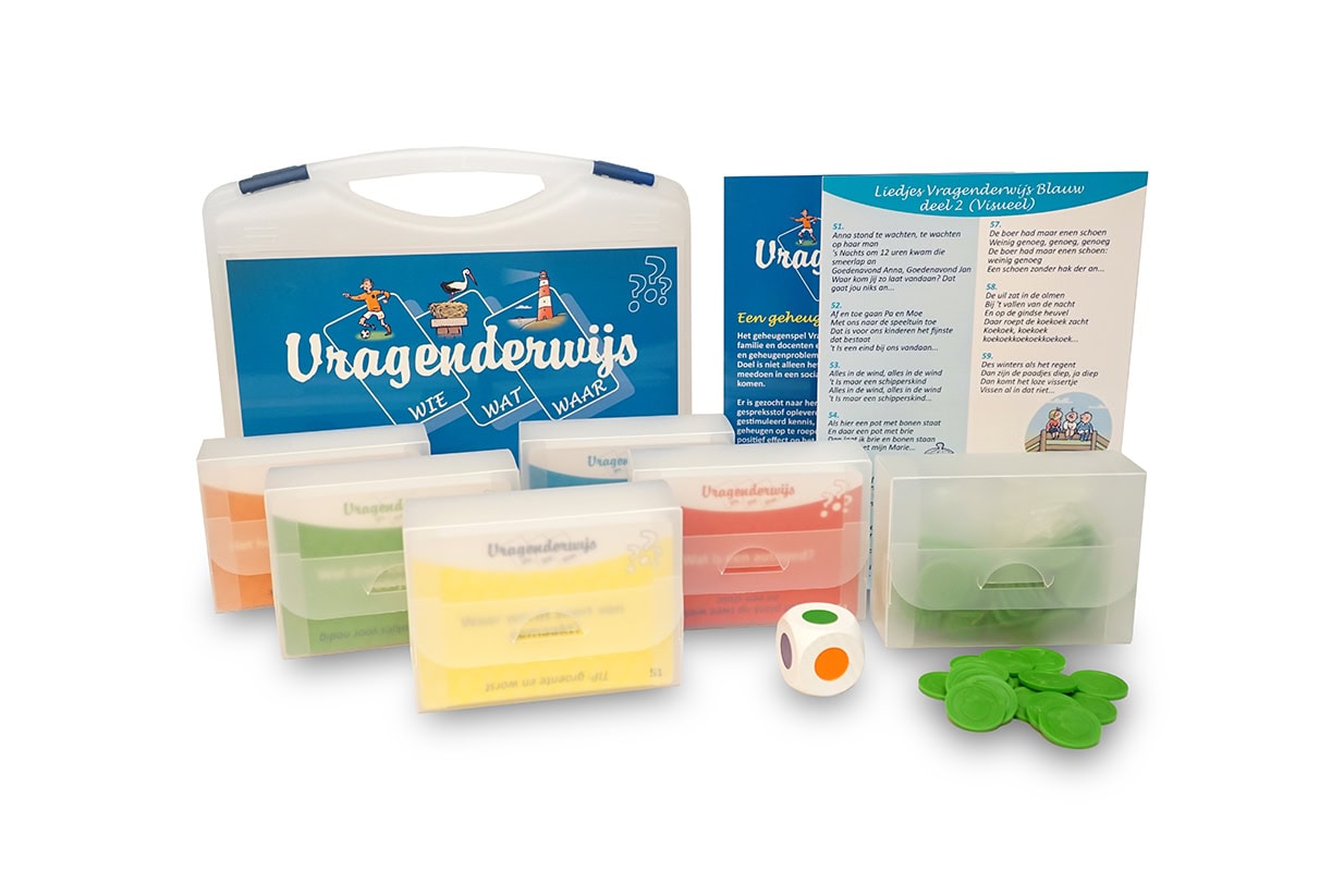Ook de serie Blauwe koffers ‘Vragenderwijs’ zijn een begrip in Nederland! Het geheugenspel Vragenderwijs Blauw Deel 2 Visueel biedt een handvat om mensen met concentratie- en geheugenproblemen op een plezierige manier te activeren. Vragenderwijs Blauw 2 Visueel bevat 350 kaarten met vragen verdeeld over vijf verschillende thema’s. De vragen staan in grote letters op de stevige, professioneel gelamineerde kaarten. De sets met vragen in de Blauwe koffers zijn veel makkelijker dan de vragen in de Rode koffers! Sinds de Blauwe serie koffers afgelopen jaren is vernieuwd bevatten de kaarten met vragen illustraties (op de achterzijde). Daardoor zijn nieuwe werkvormen mogelijk, zoals bijvoorbeeld associëren op de tekeningen. Doordat er zowel makkelijke als ets moeilijkere vragen zijn, is differentiatie mogelijk. Dat maakt de Blauwe koffer Vragenderwijs ook interessant voor andere doelgroepen, zoals mensen met een beperking.