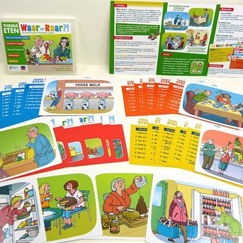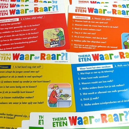 Aansluitend bij de koffer ‘Ik Kies Mijn Eten’, zijn meerdere spelmethode ontwikkeld, waaronder ‘Waar of Raar – Thema Eten’. Een spel over alledaagse situaties rond eten. De kaarten met vragen en uitdagende en soms ‘rare’ tekeningen brengen leerlingen en cliënten op een leuke speelse manier met elkaar in gesprek. De vraag ‘Is dit Waar of Raar?’ is een onweerstaanbare uitnodiging tot gesprek. De dertig kaarten, met aan de ene zijde afbeeldingen en aan de andere zijde vragen, maken het makkelijker om met leerlingen, cursisten en cliënten in gesprek te gaan over waarden en normen, hygiëne en veiligheid, gezondheid, keuzes, zelfregie en deelname aan de maatschappij. Onderwerpen zijn o.a.: waar komt het eten vandaan; veiligheid en hygiëne In de keuken; gezond of ongezond; tafelmanieren en zelf eten kiezen.